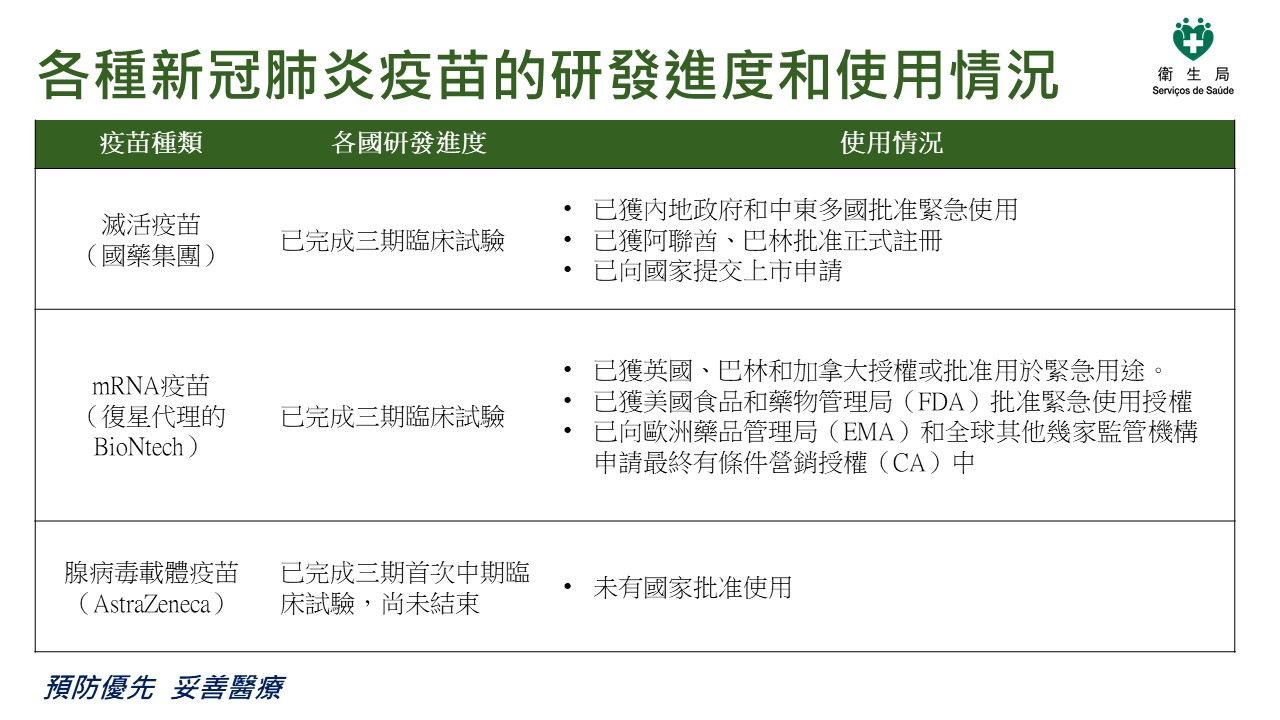 政府計劃購入三種來自不同產地的疫苗,各採購40萬劑(不包括GAVI計劃的20萬劑),並將分批供應到澳門。當中,產地為北京、國藥集團供應的滅活疫苗,預計交貨期首批在第一季;產地為德國、法國或比利時、復星代理的BioNtech mRNA疫苗,預計交貨期首批在第一季;產地待定、AstraZeneca代理的腺病毒載體疫苗,預計交貨期首批在第二季。政府會持續留意世界各地有關疫苗接觸情況,以及監察不良事件等。