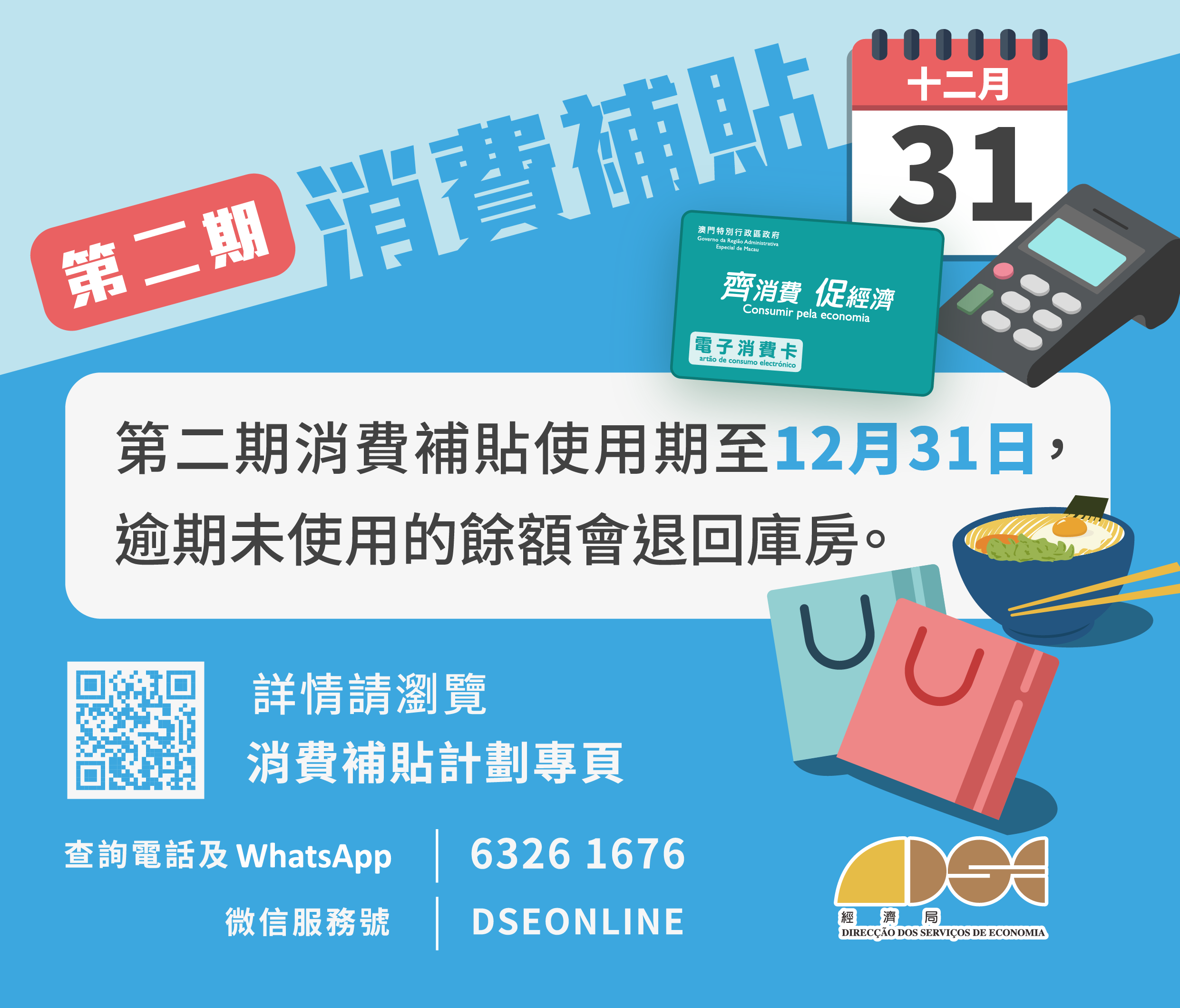第二期消費補貼使用期至明(31)日結束,特區政府呼籲已領取補貼的居民及時使用,逾期未使用的餘額會退回庫房。