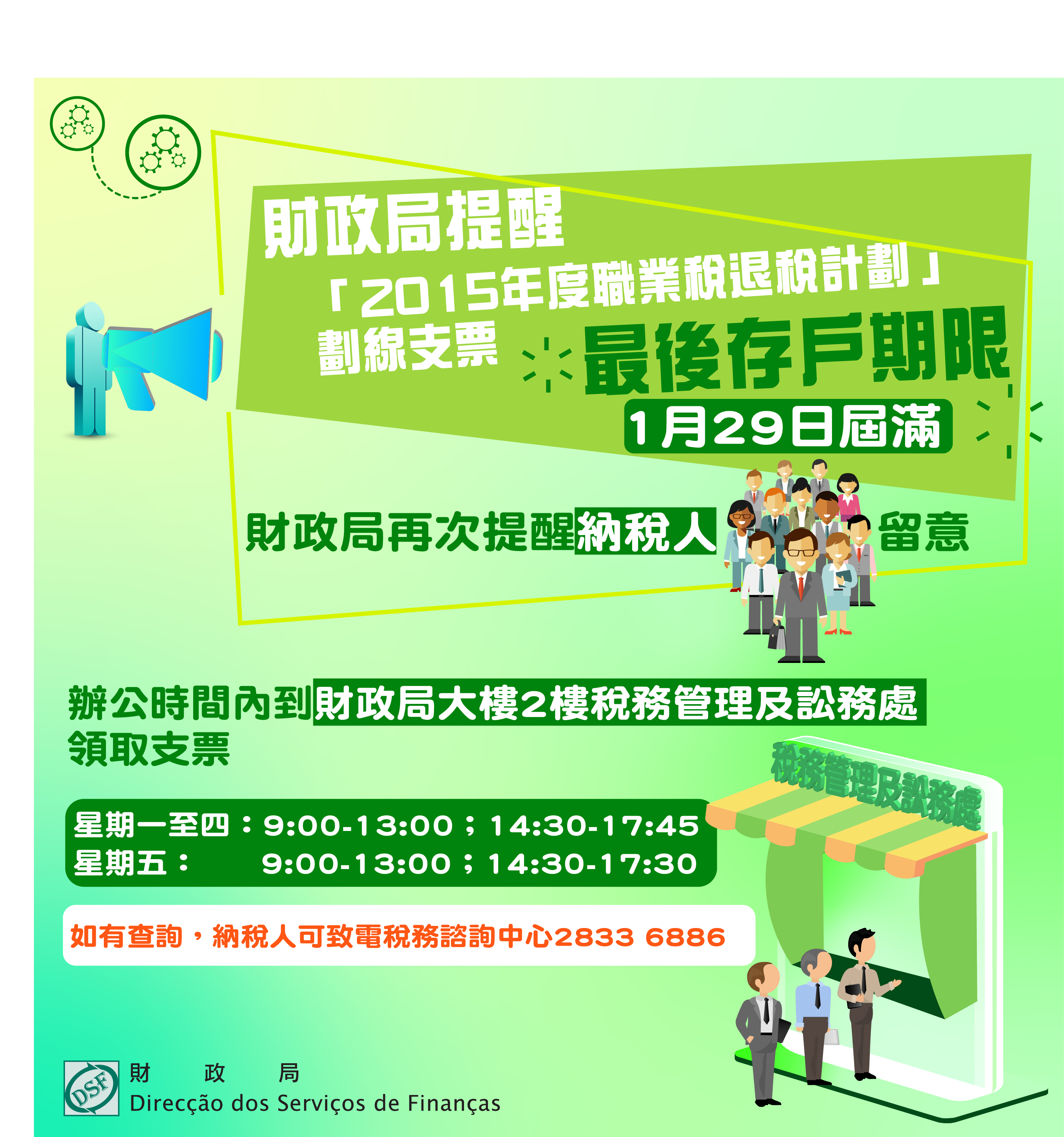 根據2017年財政年度預算案之規定,「2015年度職業稅退稅計劃」劃線支票之存入銀行期限即將於1月29日屆滿,財政局再次提醒納稅人留意。