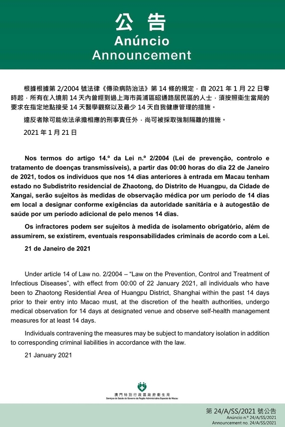 新型冠狀病毒感染應變協調中心宣佈,因應上海巿及吉林省的最新疫情發展,衛生局根據第2/2004號法律《傳染病防治法》第14條的規定,自2021年1月22日零時起,所有在入境前14天內曾經到過上海市黃浦區昭通路居民區或吉林省松原市松原經濟技術開發區的人士,須按照衛生當局的要求在指定地點接受14天醫學觀察以及最少14天自我健康管理,違反者除可能依法承擔相應的刑事責任外,尚可被採取強制隔離的措施。