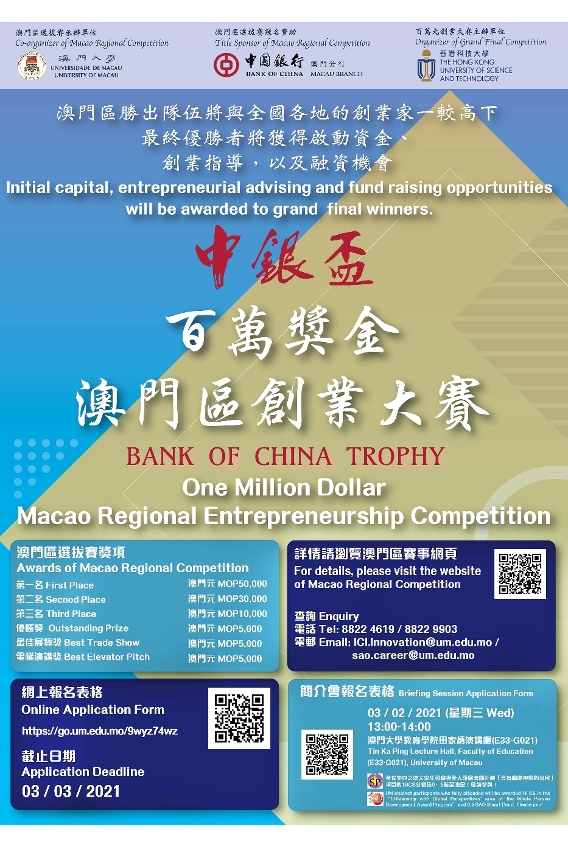 由澳門大學舉辦的“2021中銀盃百萬獎金澳門區創業大賽”現正接受報名,歡迎澳門大專院校在讀學生及在澳門境外大專院校就讀的澳門居民參加。澳門區選拔賽獎金超過十一萬澳門元,首三強將晉級總決賽,贏取百萬元人民幣獎金,更有機會獲得融資。