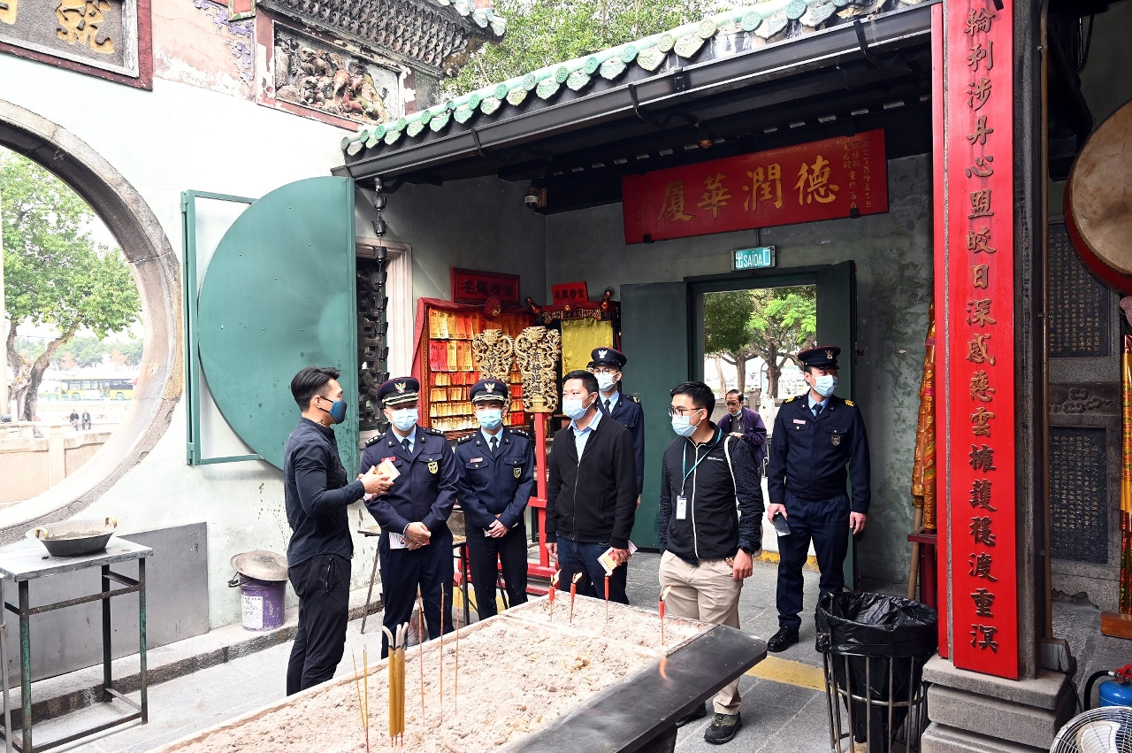 兩局一連三日分別前往澳門及離島共四十多間廟宇,現場排查廟宇環境和用電安全情況,向管理者瞭解農曆新年期間廟宇的香火和祭祀安排,提醒廟宇管理者須加強用電安全管理,並提前做好新年祭祀高峰的應對預案,包括:遵照衛生部門指引做好防疫措施、規劃廟內人流疏導路線、加派人手維持秩序、妥善管理廟內香火、協助善信使用化寶爐、呼籲減少香火或改用非燃燒的祭祀方式、處理廟內積存雜物等;同時促請各廟宇遵守《澳門廟宇消防安全指引》,切實執行“室內香火禁止過夜,夜間必須關閉電源”等廟宇消防安全措施,共同做好消防和管理工作。此外,文化局亦向各廟宇作進一步呼籲,鑒於近日不同地區均出現疫情反覆的情況,為嚴謹做好疫情防範工作,建議考慮今年暫時停辦年三十晚上頭炷香活動,以減低大量人群聚集而產生的疫情傳播風險。是次巡查由文化局文化遺產保護處處長何卓鋒及消防局副一等消防區長譚健明主持。