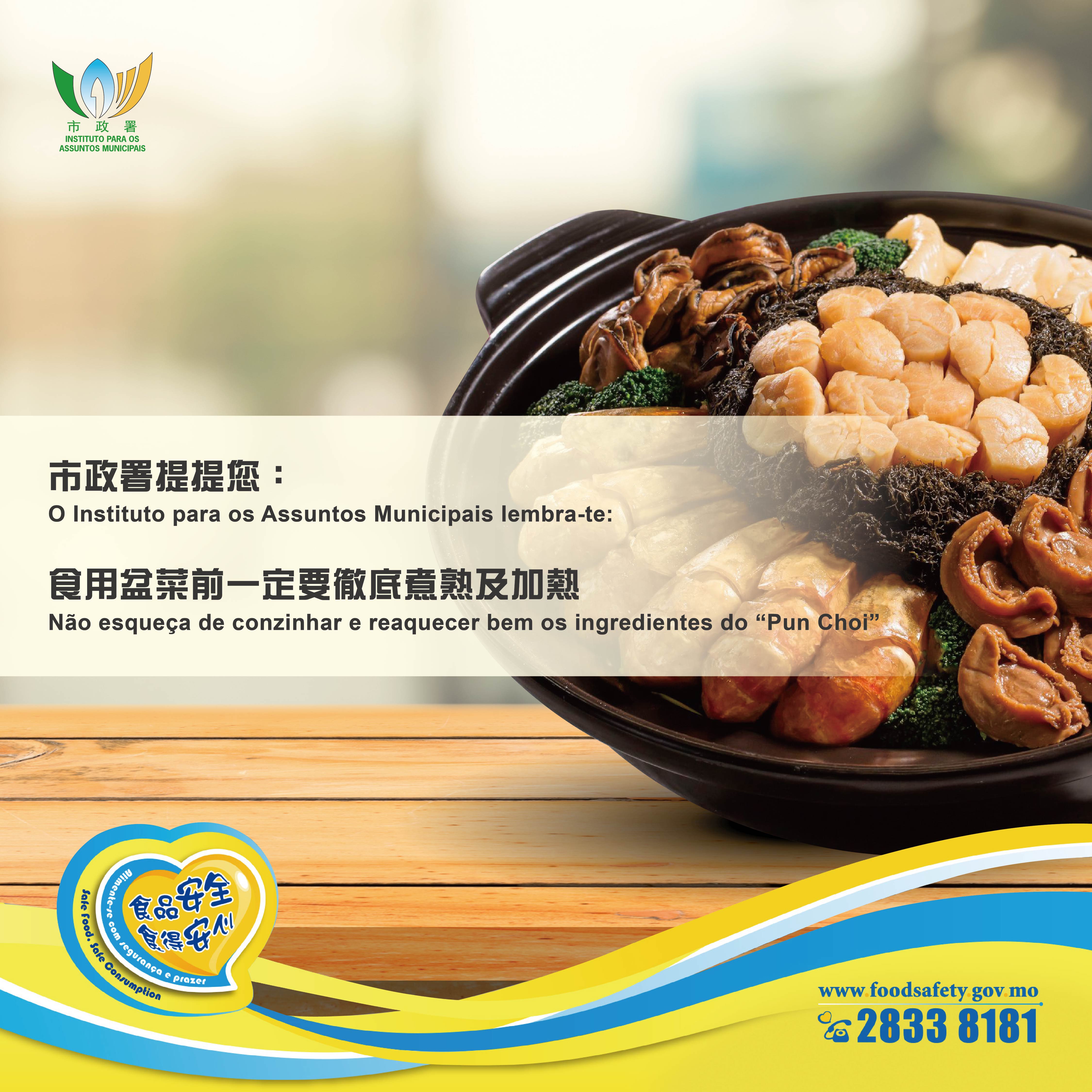 市政署於農曆新年前持續派員走訪供應賀年盆菜的餐廳食肆,派發「安心享用盆菜」等宣傳單張,輔導餐飲從業員做好食安及衛生操作,並提醒業界須嚴格遵從市政署發出的「預防新型冠狀病毒肺炎的食品安全衛生指引」等指南,加強對食物、環境及人員的安全衛生管理,尤其須加強對設施設備的清潔消毒。另外,貯存及處理食品食材時,須遵守「生熟分開」原則,切勿過早及過量囤積備用食材,並注意溫度與時間的控制,慎防交叉污染。