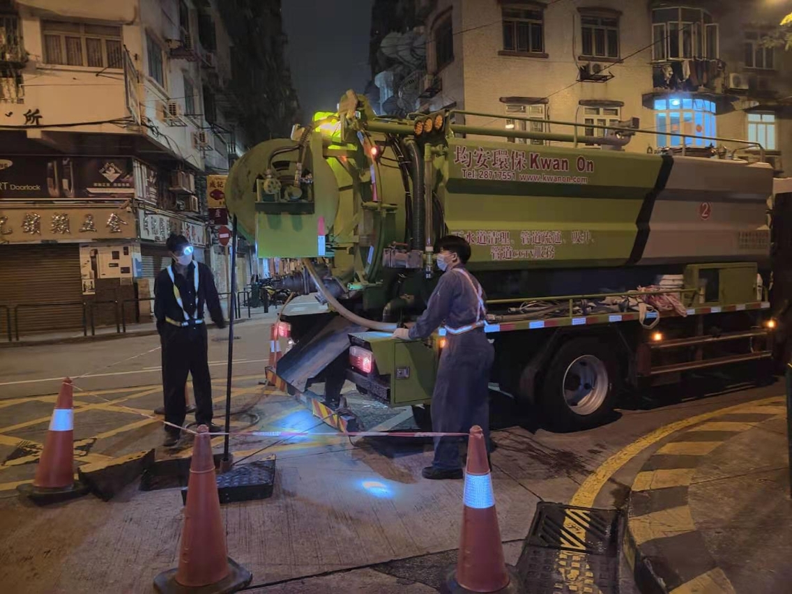 市政署於每年風雨季來臨前重點跟進經常淤塞的下水道狀況,確保渠網排澇效能正常,去年引入外判下水道影像記錄及清渠服務,藉以加強對渠網精準檢查、清淤及養護。首階段對經常淤塞的下水道展開工作,並已完成北京街與上海街部分內街之下水道清淤。