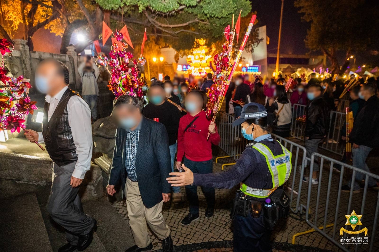 於年三十晚,因有不少信眾會到廟宇祈福及“上頭炷香”,治安警察局加派人員到媽閣廟、天后宮及譚公廟等多所廟宇外維持現場秩序,以及疏導人流有序進入廟宇。此外,為打擊農曆新年期間違規燃放爆竹及煙花的行為,令市民可安寧度歲,警方於農曆新年前派員到社區宣傳“切勿違例燃放煙花或爆竹”資訊;同時,在農曆新年期間派員加強巡查及監察各區違規燃放或售賣爆竹、火箭及煙花的情況;2月11日至17日期間,本局未有發現上述違規行為,去年同期(年三十至年初六,下同)有關違規為2宗。噪音方面,於上述期間共檢控4宗噪音違規個案,去年同期則為2宗。打擊的士違規方面,於上述期間共檢控6宗個案(濫收車資1宗、拒載1宗及其他違規情況4宗),去年同期則為5宗。