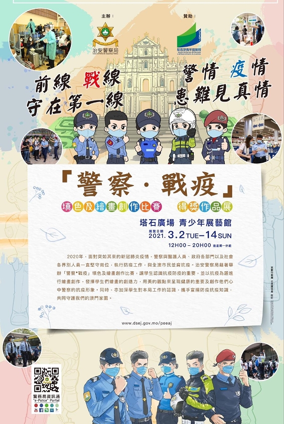 為喚起本澳青年關注社會各界在疫情下的防疫抗疫工作,並繼續深化「警‧校聯絡機制」共同推進青年參與有益身心活動,治安警察局舉辦「警察‧戰疫」填色及繪畫創作比賽,冀讓學生發揮自身繪畫創作的潛能,以視覺藝術角度呈現警民堅守抗疫的精神,從中亦可加深他們對警隊工作的認識,是次填色及繪畫創作比賽共徵集得約1,750份來自澳門中、小學的參賽作品。