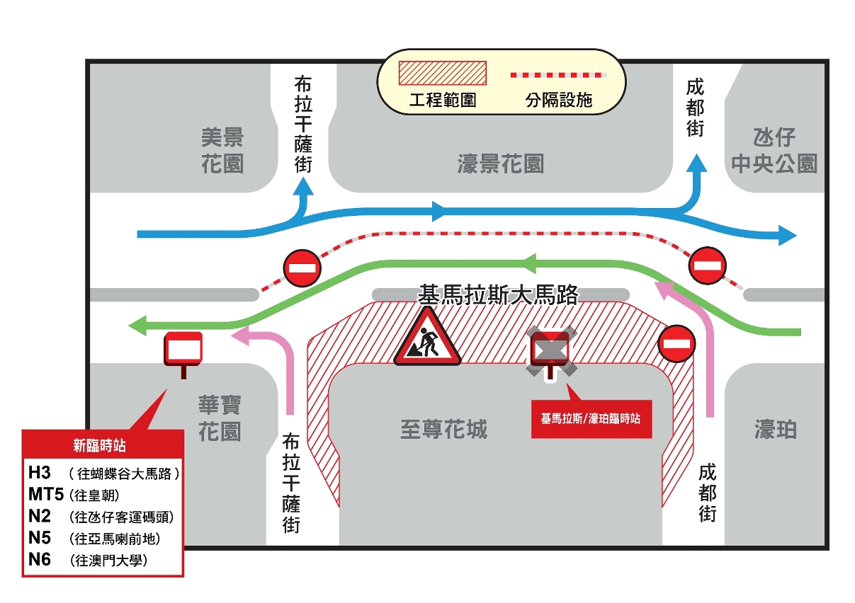 配合基馬拉斯大馬路重鋪工程,介乎布拉干薩街與成都街、靠近至尊花城一側的一段基馬拉斯大馬路於3月3日(周三)起實施封閉交通,近濠景花園一側的路段則實施臨時雙向行車;另外,現時設於至尊花城對出的基馬拉斯/濠珀臨時站會往運動場圓形地方向遷移約100米至華寶花園對出,詳情請查閱澳門公共汽車股份有限公司網頁http://www.tcm.com.mo/web/NewsVB/data/619_cn.pdf及新福利公共汽車有限公司網頁 https://www.transmac.com.mo/route-change/045-2021/。