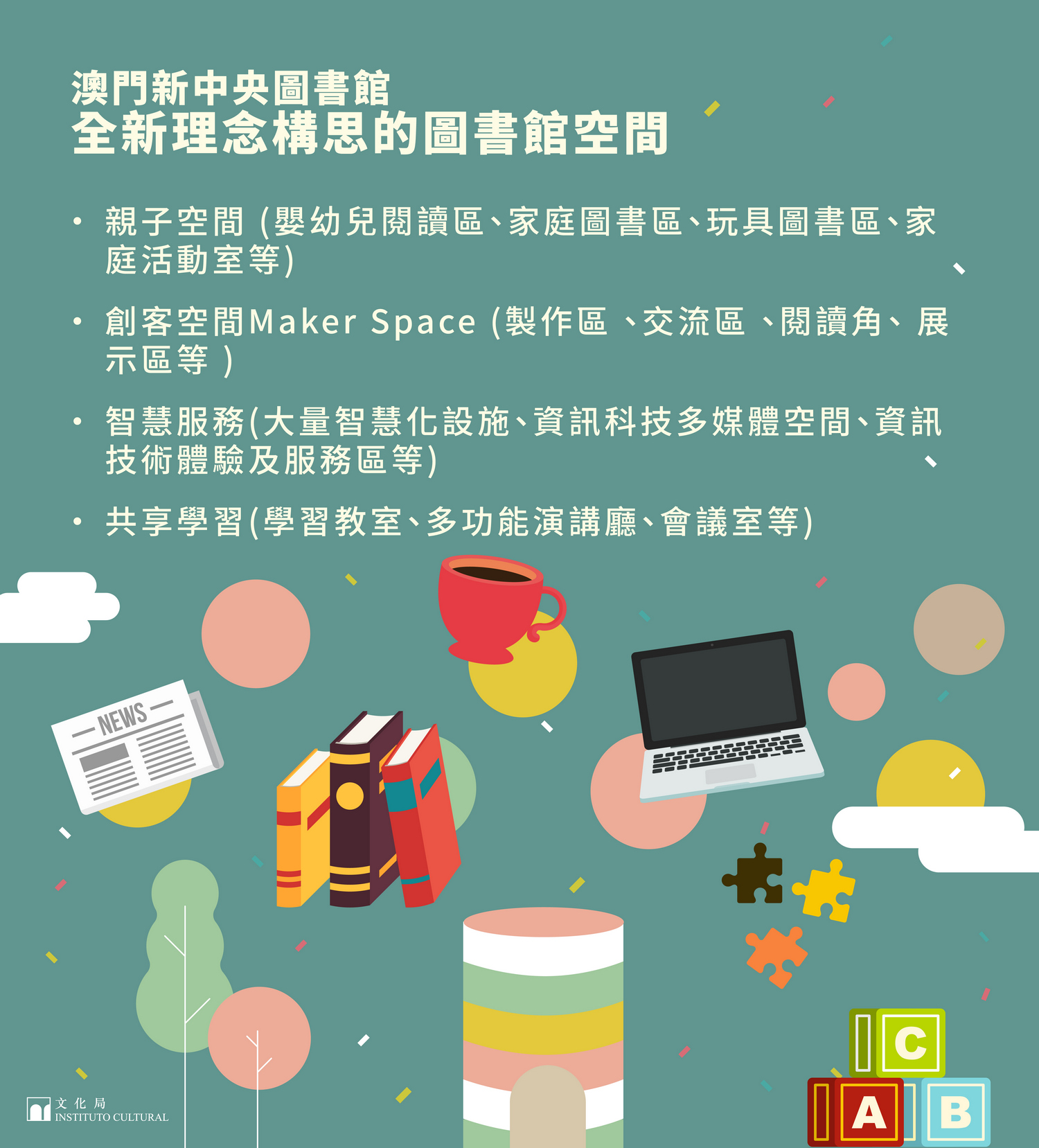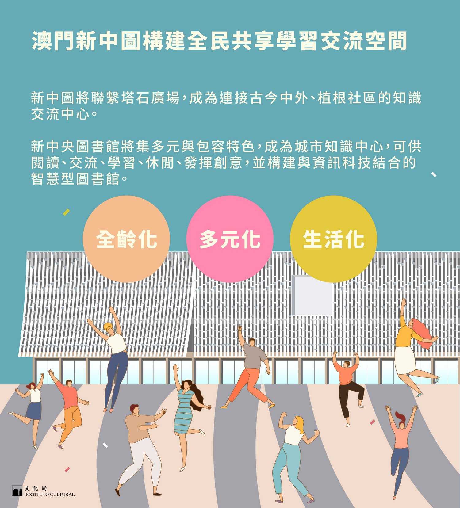 未來的新中央圖書館將與周圍環境產生良性互動,毗鄰的塔石廣場將成為設計的組成部分,促進整個公共場域的活力。在功能規劃方面,將突破大眾對於傳統圖書館的想像,符合21世紀圖書館多功能的需求,建設複合型的空間,除了閱讀,更是可供交流、學習、休閒、發揮創意,是一個與生活息息相關的場所;將設有演講廳、多用途會議室、創客空間 (製作區、交流區、閱讀角、展示區等)、資訊科技多媒體空間、嬰幼兒閱讀區、家庭圖書區、玩具圖書區、家庭活動室、學習教室、資訊技術體驗及服務區等等以全新理念構思的圖書館空間,同時提供大量智慧化設施,讓市民能享用學習和創意資源,共享學習,並設有關懷全民使用的通用設施。文化局將透過打造這座城市的知識中心,使文化共融於每個人的生活。