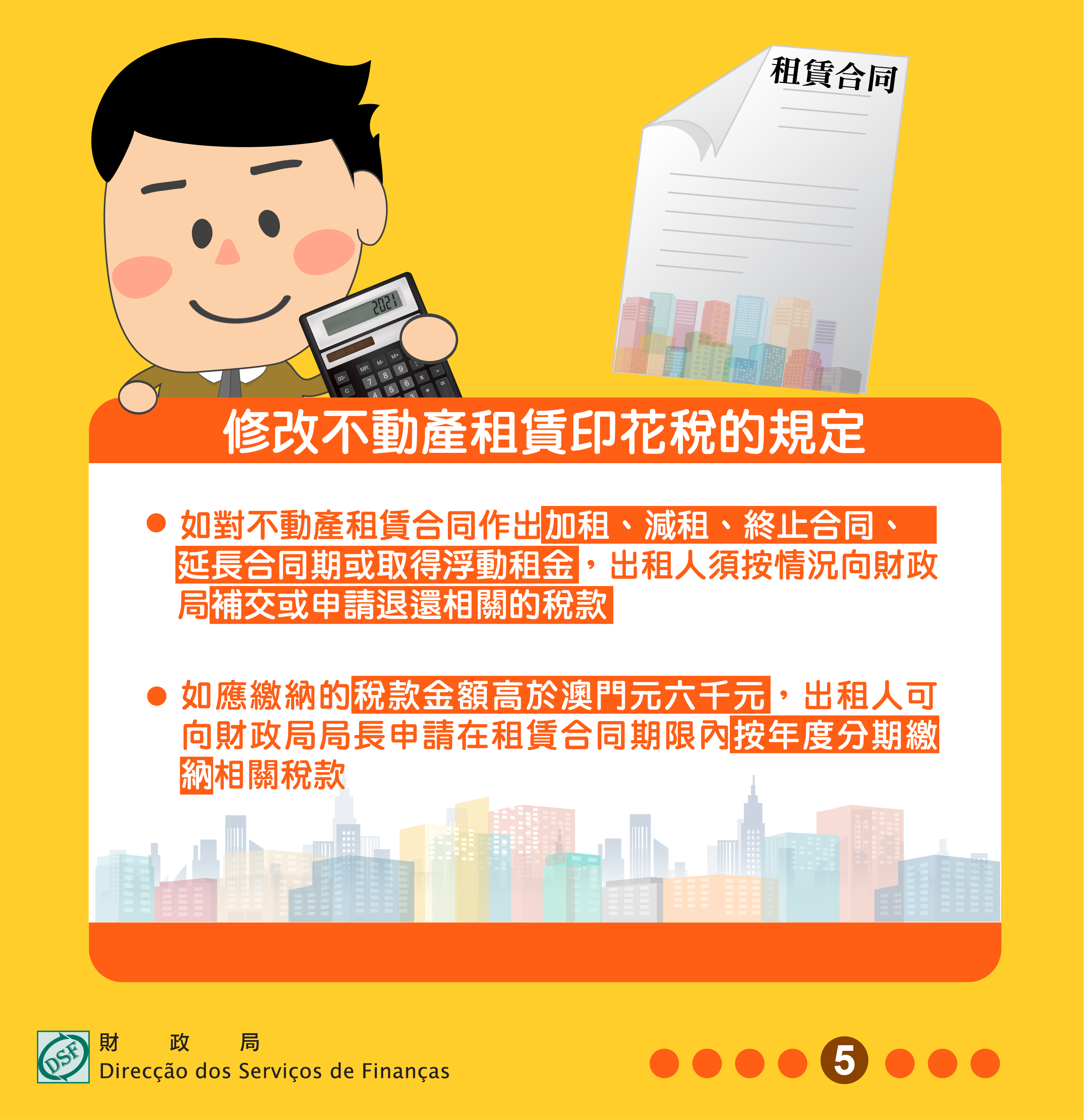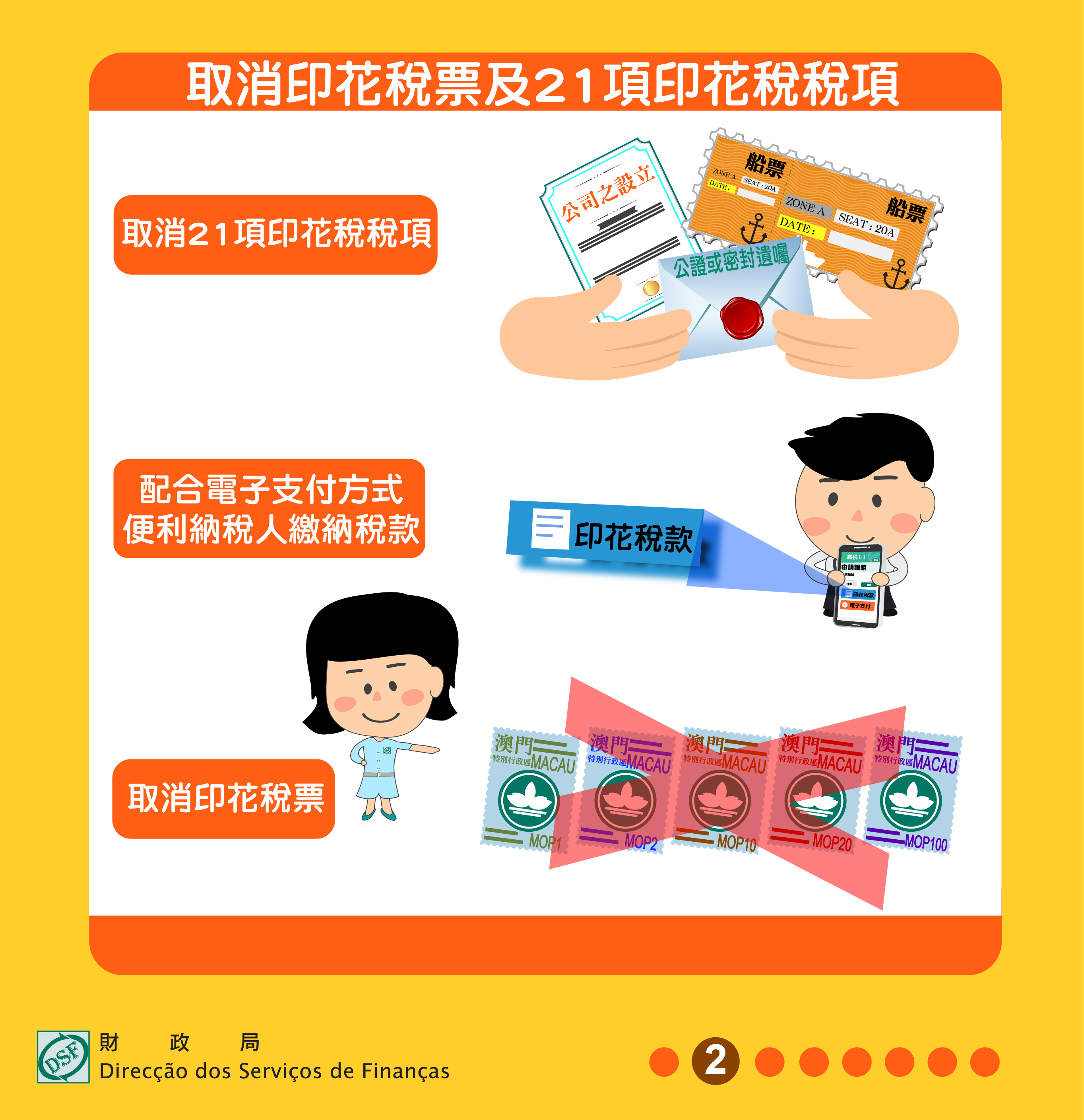 因應電子支付普及使用,並配合社會經濟發展,特區政府修訂《印花稅規章》及《印花稅繳稅總表》,取消21項印花稅稅項,簡化稅款結算及徵收程序,便利納稅人繳納稅款;已繳納的印花稅可因不動產租賃合同提前終止而申請退還部分稅款;為鼓勵透過仲裁解決不動產租賃爭議,相關租賃合同的印花稅可獲減半等;增加不履行稅務義務的違法成本,以打擊和減少逃漏稅的違法行為。