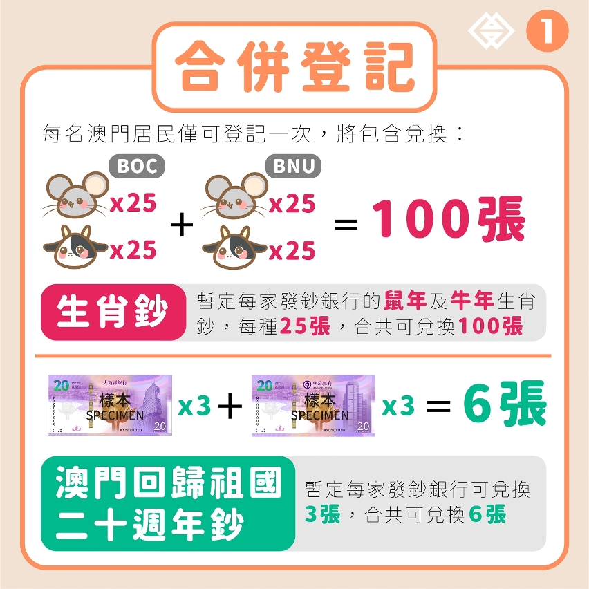 兩家發鈔銀行所發行的庚子鼠年及辛丑牛年生肖鈔,連同早前已發行的澳門回歸祖國二十週年鈔,將合併讓澳門居民登記兌換。網上登記期由下週一(3月22日)起。