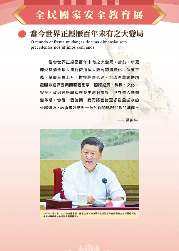 在“百年未有之大變局下的國家安全”章節中,引述了習近平主席於2020年的講話。他表示,當今世界正經歷百年未有之大變局。當前,新冠肺炎疫情全球大流行使這個大變局加速變化,保護主義、單邊主義上升,世界經濟低迷,全球產業鏈供應鏈因非經濟因素而面臨衝擊,國際經濟、科技、文化、安全、政治等格局都在發生深刻調整,世界進入動盪變革期。今後一個時期,我們將面對更多逆風逆水的外部環境,必須做好應對一系列新的風險挑戰的準備。