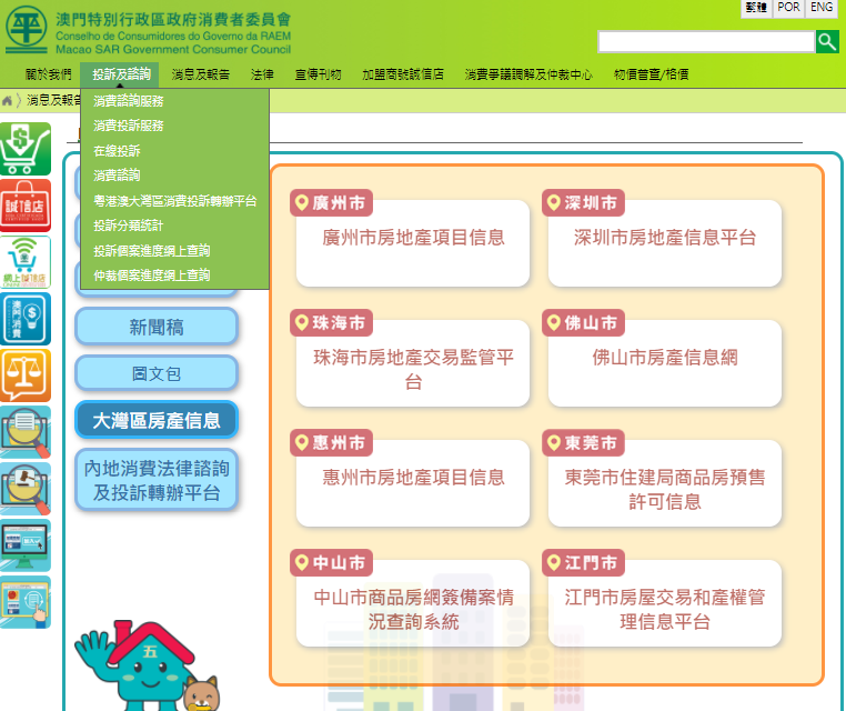 目前,“內地購房資訊”專區已與廣州、深圳、珠海、佛山、惠州、東莞、江門及中山八個城市監管房產交易信息的網上平台連線,消費者利用專區內資訊就可核實“五證”:《國有土地使用證/不動產權證》、《建設用地規劃許可證》、《建設工程規劃許可證》、《建築工程施工許可證》和《商品房預售許可證》證號,查核發展商、房產坐落位置、分層單位的房屋用途、銷售狀態、單位面積等資料,以及相關房產樓款的監管專用帳戶,以降低風險。
