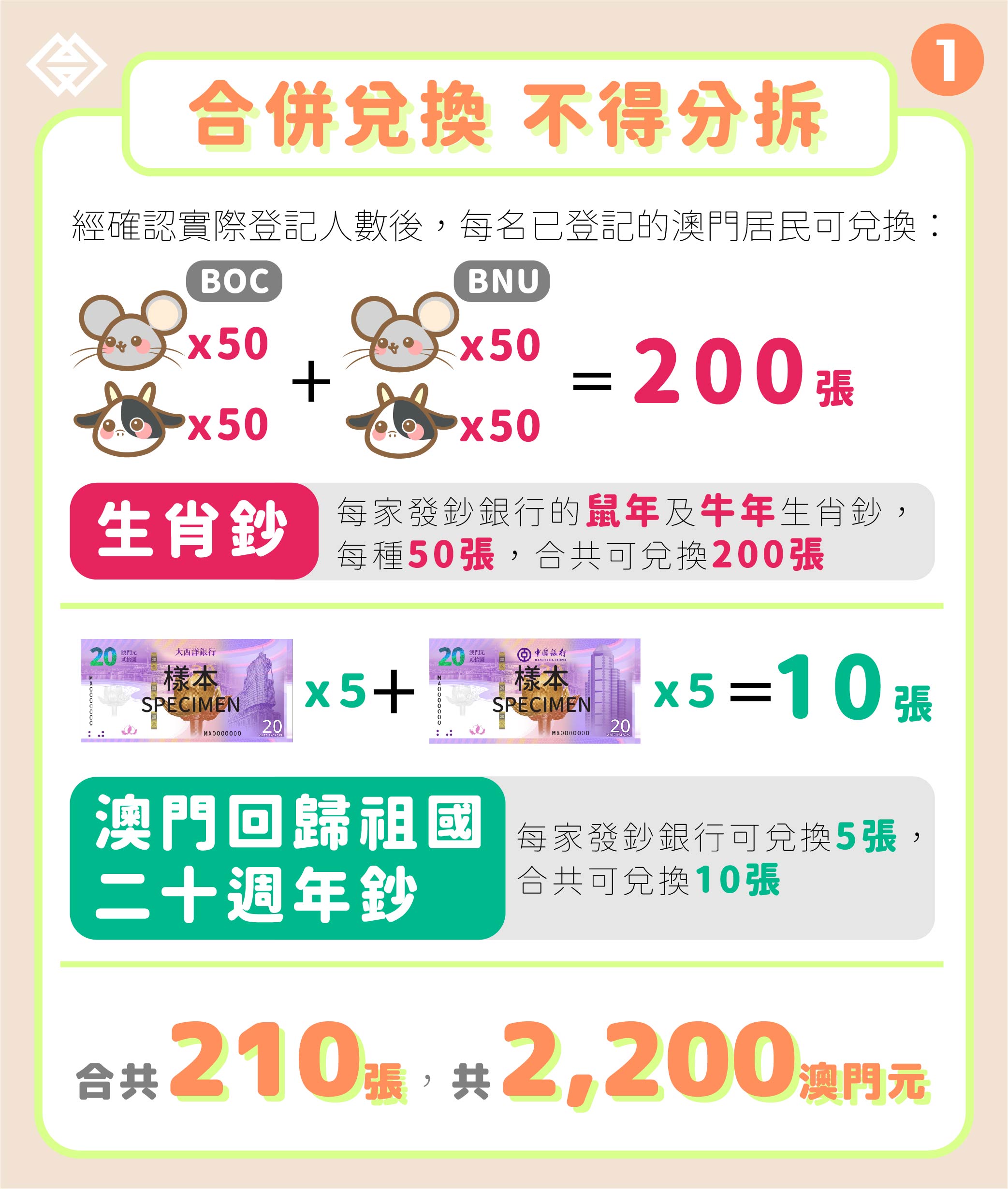 經確認實際登記人數後,每名已登記的澳門居民可兌換每家發鈔銀行發行的庚子鼠年和辛丑牛年生肖鈔各50張、澳門回歸祖國二十週年鈔各5張,即合共可兌換鈔票總數量為210張,兌換所涉及金額為2,200澳門元。