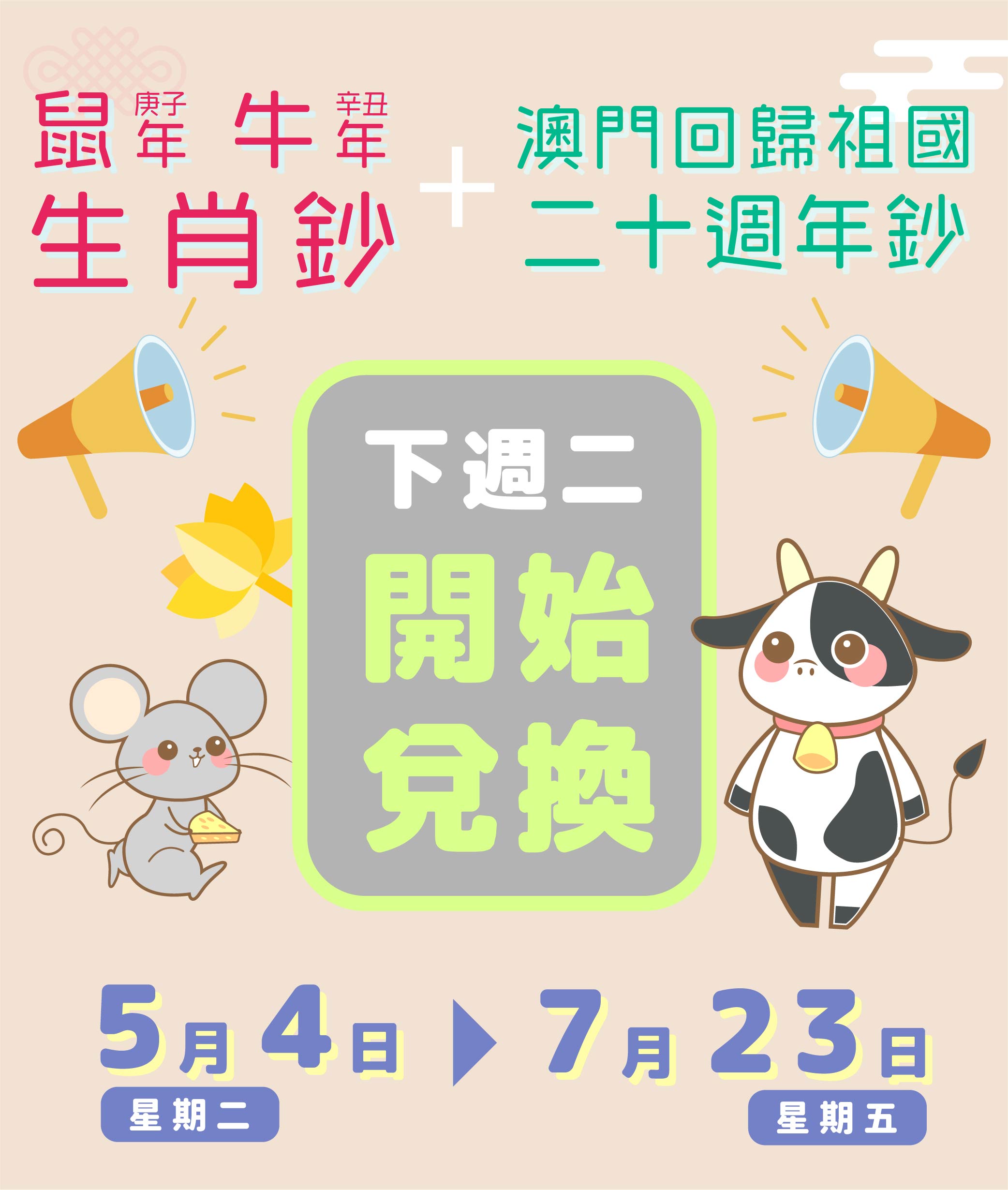 鼠年、牛年生肖鈔,及澳門回歸祖國二十週年鈔的網上預約登記,早前已經順利完成,各參與銀行將於下週二(5月4日)起提供兌換服務。