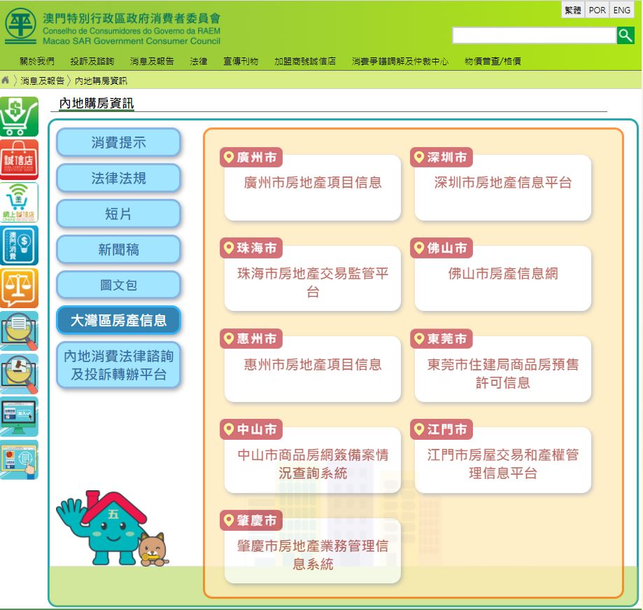 經科局及消委會今年一月起開展與大灣區城市群建立監察房產銷售廣告的聯防機制,加強兩地信息互動及普法的合作,經科局及消委會逐一邀請大灣區內地9個城市加入“聯防機制”,灣區城市群相關單位表示支持及給予積極回應,在四個月內已與整個大灣區城市群快速建立“聯防機制”,機制內的“內地購房資訊”專區可供居民核實“五證”證號,查閱發展商、房產坐落位置、分層單位的房屋用途、銷售狀態、單位面積等資料,以及相關房產樓款的監管專用帳戶,現時專區已全面與廣州、深圳、珠海、佛山、惠州、東莞、中山、江門及肇慶9個城市監管房產交易信息的網上平台連線。
