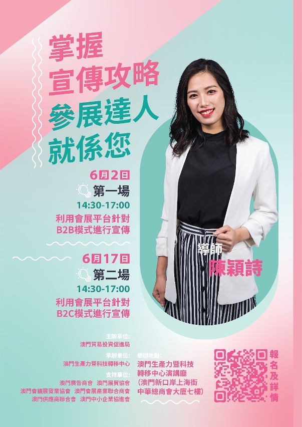 為提升本澳企業參展成效,協助本澳企業適應新業態,拓展更大市場,澳門貿易投資促進局將於5月至6月舉辦一連四場“澳門參展企業培訓課程”,邀請行業代表圍繞 “澳門參展攻略培訓”及 “線上直播推廣產品及服務培訓”兩大主題,深入講解參展時各階段的準備工作,以及會展直播平台上的銷售技巧。活動即日起接受報名,費用全免,歡迎本地企業踴躍參加。