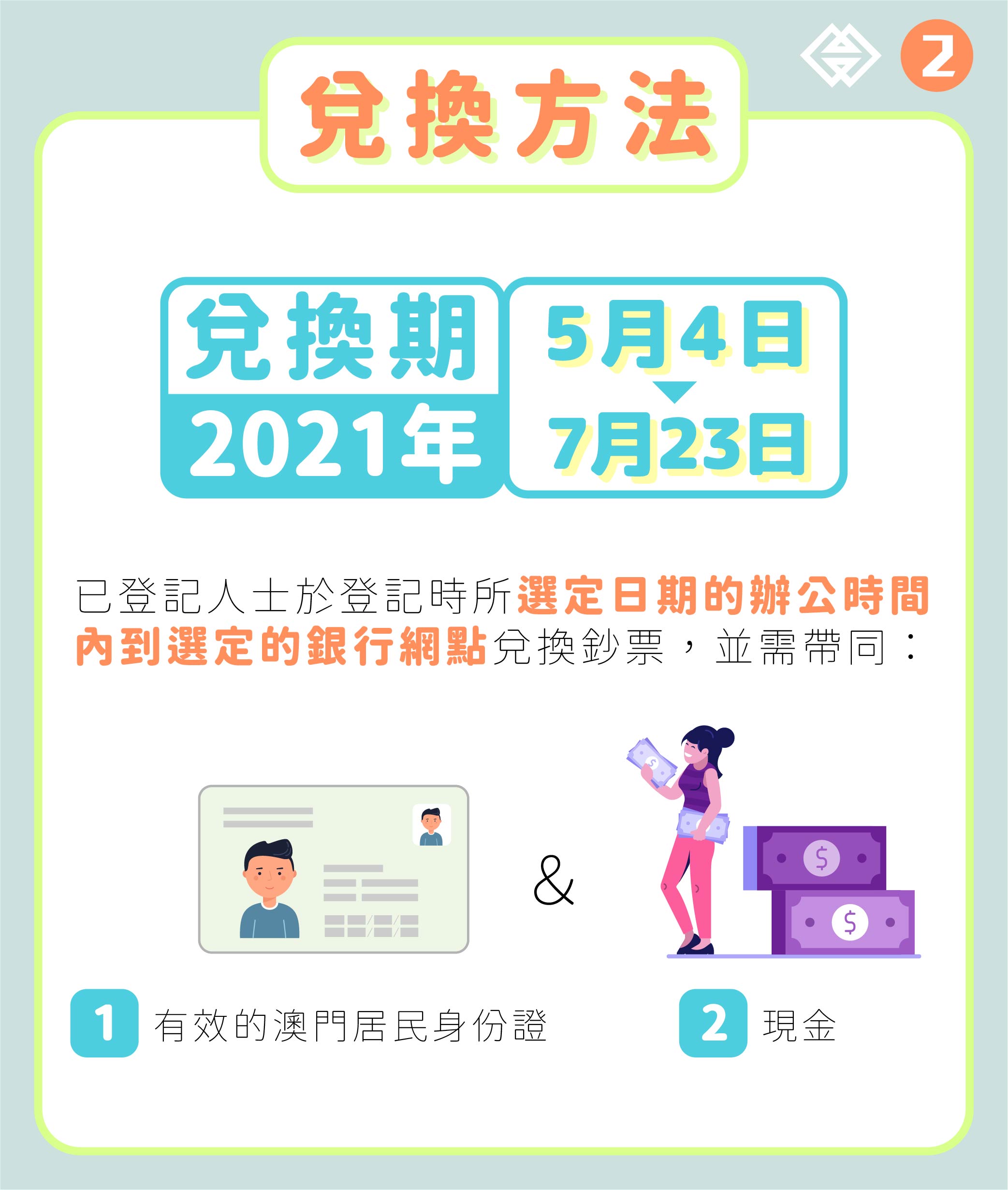 鼠年、牛年生肖鈔,及早前已發行的澳門回歸祖國二十週年鈔,今(4)日起至2021年7月23日提供兌換服務。每名已登記的澳門居民可於登記時所選定的日期,帶同有效澳門居民身份證到選定銀行網點,兌換由每家發鈔銀行發行的庚子鼠年和辛丑牛年生肖鈔各50張,以及澳門回歸祖國二十週年鈔各5張,即合共可兌換上述鈔票總數量為210張,兌換所涉及金額為2,200澳門元。