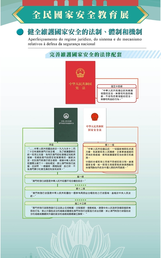 澳門特別行政區政府與中央人民政府駐澳門特別行政區聯絡辦公室今年繼續合辦“全民國家安全教育展”。展覽在“維護國家安全 確保‘一國兩制’行穩致遠”章節中,介紹了國家與澳門特區在健全維護國家安全的法制、體制和機制方面的工作,包括完善維護國家安全的法律配套。