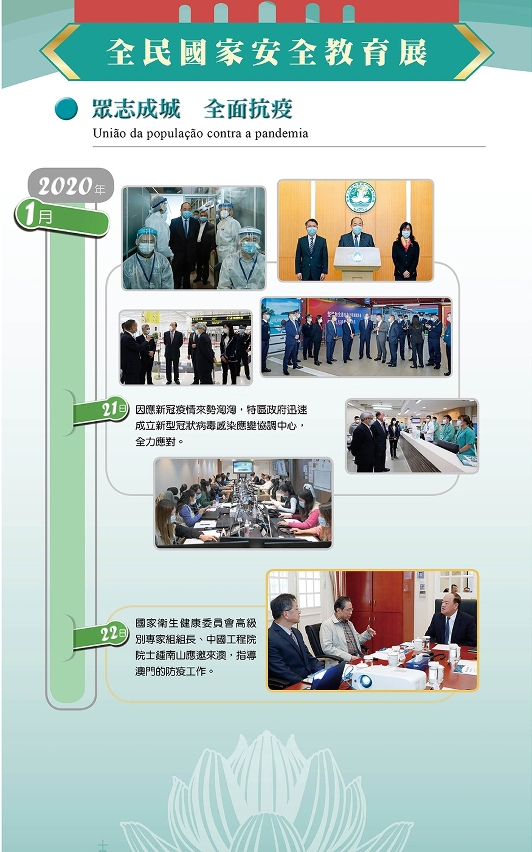 此外,應對突發的公共衛生事件,是維護國家安全的重要舉措;去年,突如其來的新冠肺炎疫情,為國家帶來了一場關乎總體安全的重大挑戰。在中央政府全方位的大力支持和無微不至的關懷下,澳門特區政府與全澳居民團結一心、科學應對,共克時艱,有效守護了廣大居民的生命和健康,社會經濟在有效的疫情防控下正逐步復元。展覽展示了特區政府與全澳居民眾志成城、全面抗疫的歷程,以及疫情防控取得的成果。