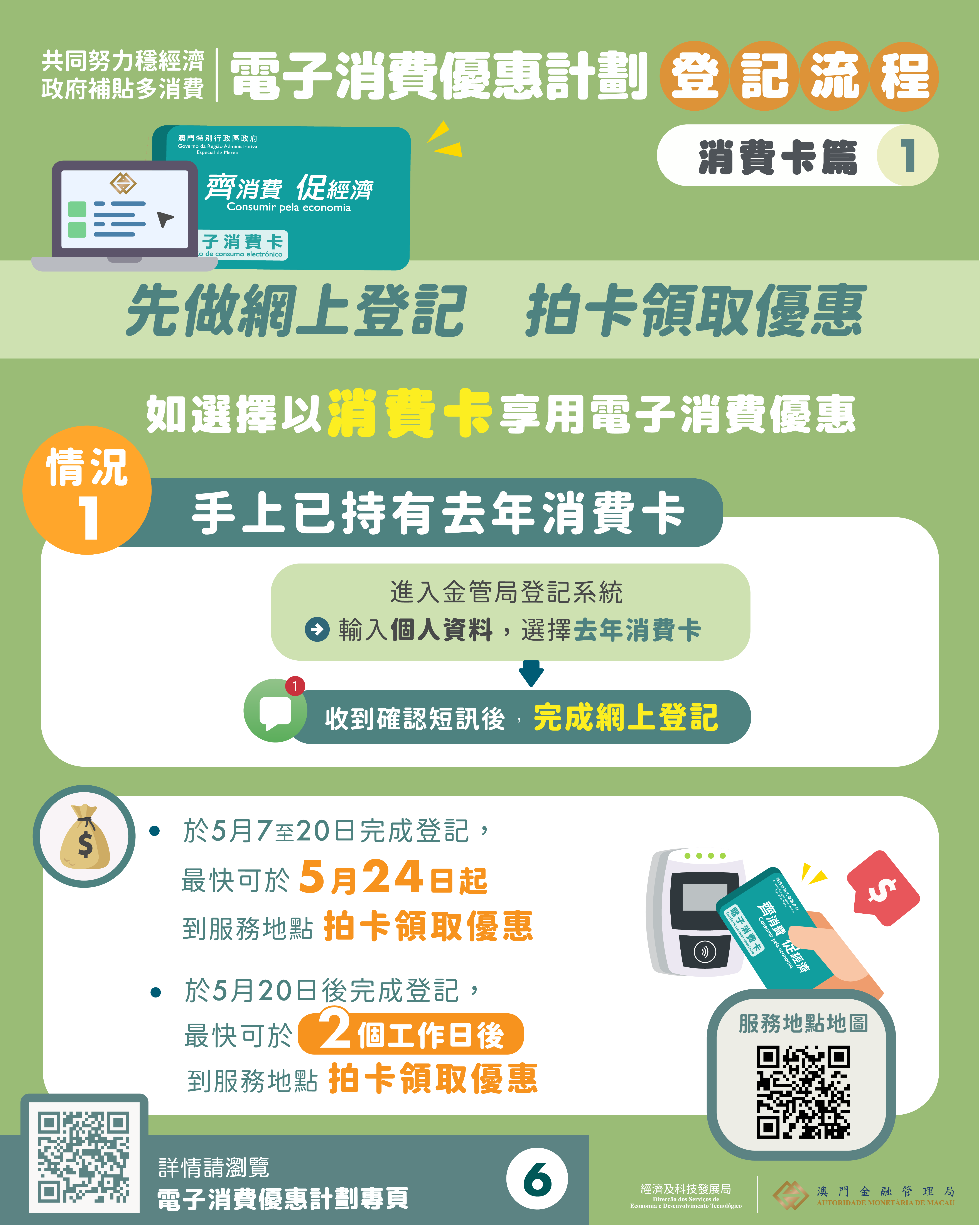 合資格的澳門居民可於5月7日早上9時起,到澳門金融管理局網頁( www.amcm.gov.mo )的網上系統,登記選擇以“實名認證的移動支付”或“電子消費卡”任一方式,領取5,000元啟動金及3,000元立減額的組合優惠。