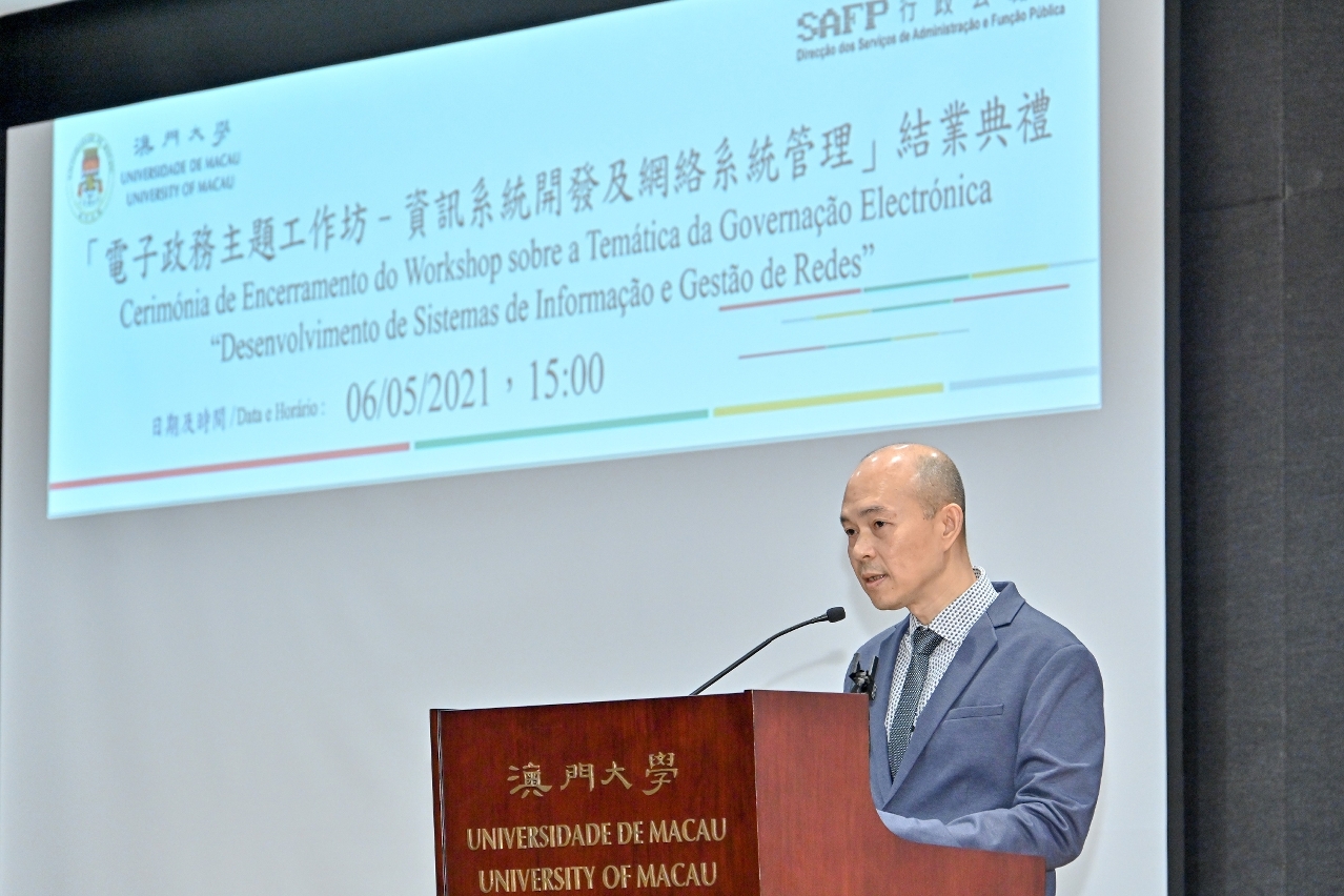 澳大科技學院副教授、電子政務主題工作坊課程主任黃輝於結業典禮上作課程總結時指出,「推動數字政府建設,提高行政效能」是澳門特區政府近年深入推進公共行政改革要點之一,「電子政務」作為其中一個切入點,利用科技手段提高政府處理行政、提供服務和管理的效率,並通過統一資訊平台以互聯網方式為巿民提供優質多元化服務。是次課程就是為澳門特區政府培養更多善用雲計算中心技術的人才,從而創造更有利的條件來深化電子政務的發展。黃教授勉勵學員以工作坊為契機,在未來電子政務的推行實踐過程中,善用所學到的內容,與特區政府的實際情況有機結合起來,建立起澳門的電子政務體系。