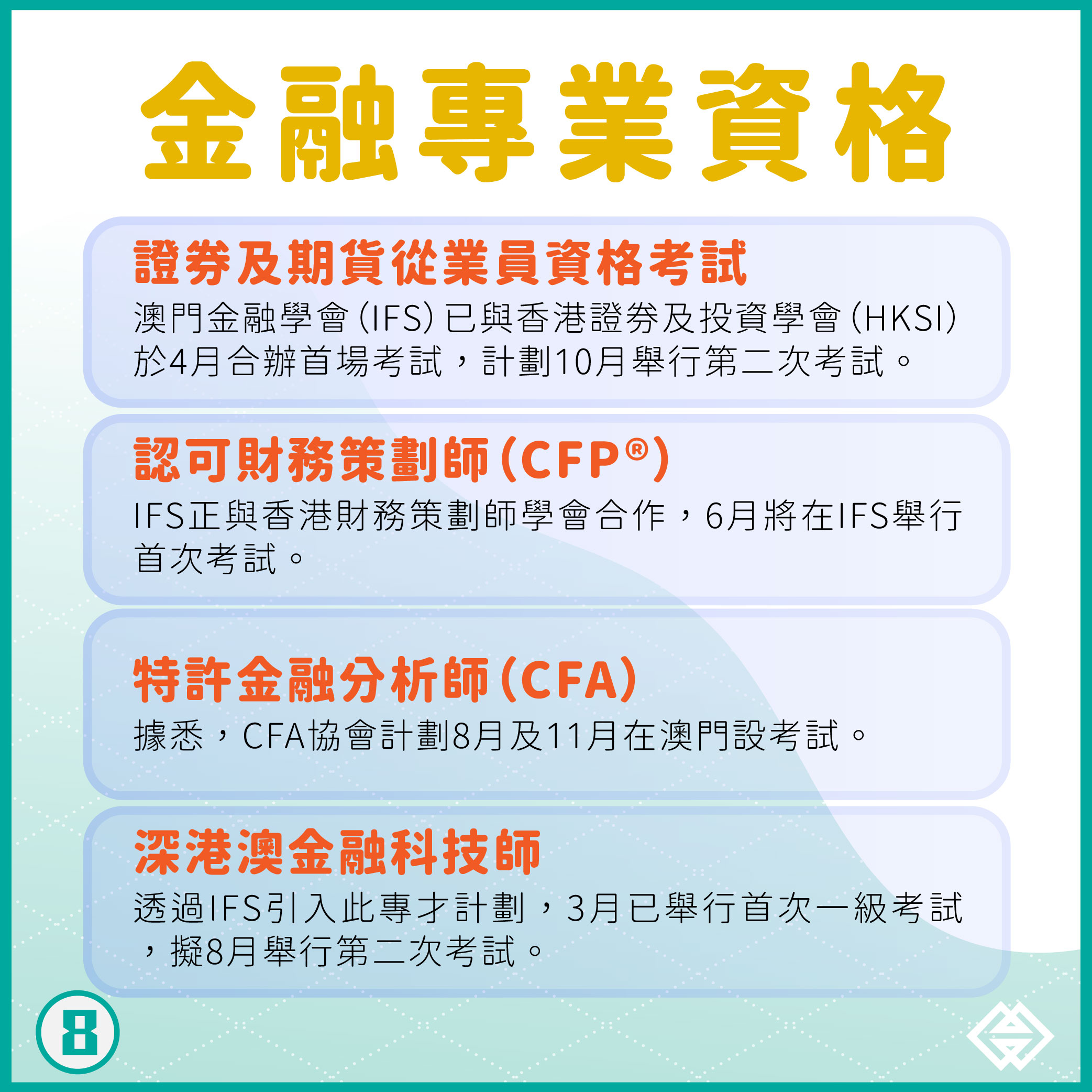 其中,為方便澳門居民考取專業資格,金管局已協調澳門金融學會與香港證券及投資學會合作,於2021年4月在澳門舉辦首場“證券及期貨從業員資格考試”,並計劃於10月舉行第二次考試;同時引入“深港澳金融科技師”專才計劃,首次考試已於2021年3月舉行;協調澳門金融學會於6月,在澳門舉辦首次“認可財務策劃師(CFP®)”考試;亦正爭取特許金融分析師(CFA)在澳門設立考點。