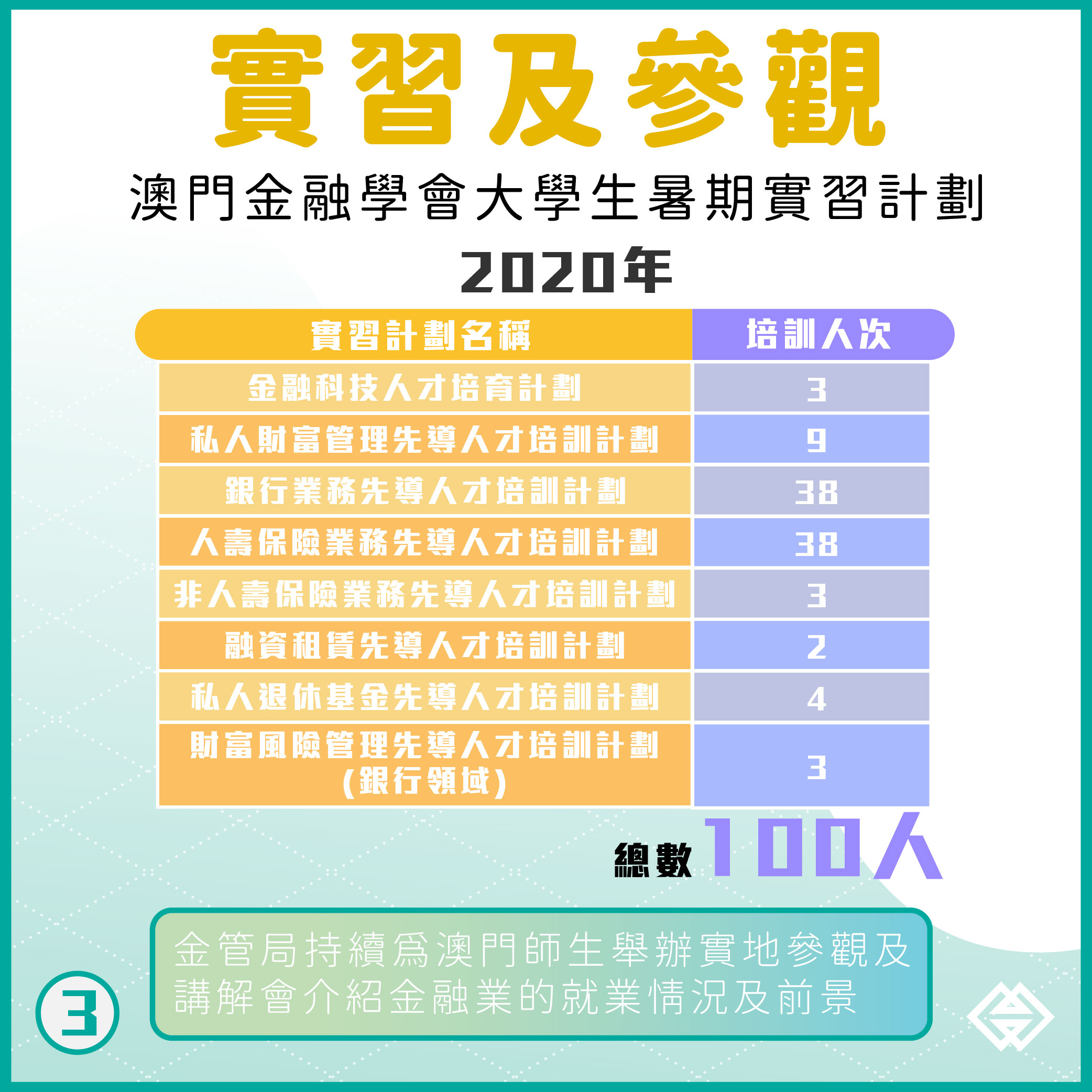 自2018年起,澳門金融學會並組織大學生到金融機構實習,2020年增設了金融科技、融資租賃等範疇的實習職位,約有100名學生參加。此外,金管局持續為澳門師生舉辦實地參觀及講解會等活動,介紹金融業的就業情況及前景,輔助有意投身金融行業的青年及早做好職涯規劃。