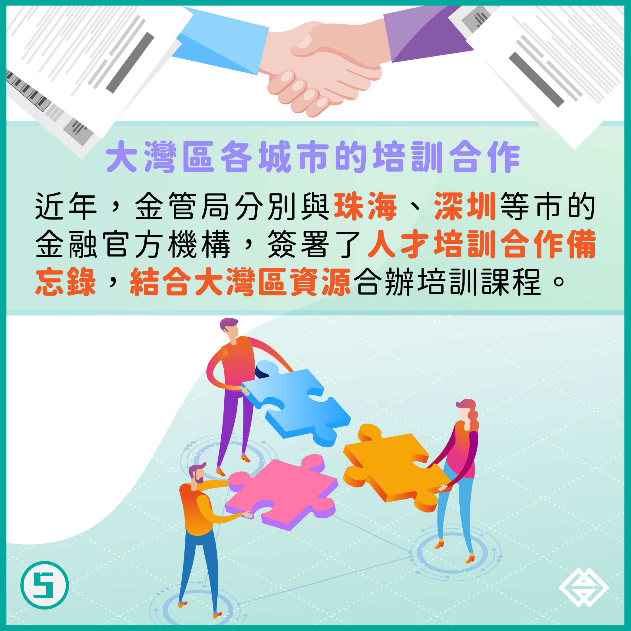 隨着區域合作進一步深化,金管局近年分別與珠海、深圳等市的金融官方機構,簽署了人才培訓合作備忘錄,結合大灣區資源合辦培訓課程,包括透過澳門金融學會與珠海方合辦了“金融科技的發展與應用高級研修班”;與珠海金融局合辦了“債券管理高級研修班”;與中葡基金合辦了兩期“澳門金融人才短期培訓班”;未來將推出更多合辦課程,持續提供人才培訓及交流機會。
