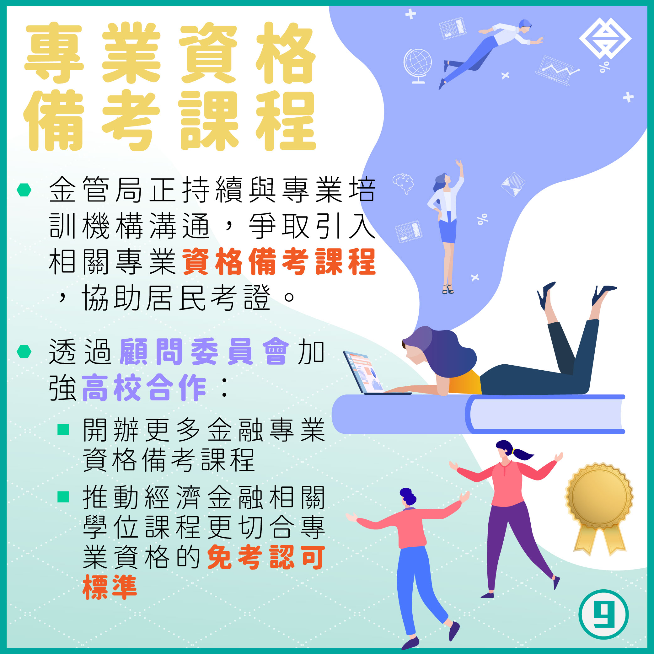 金管局亦將持續與相關專業培訓機構溝通,爭取引入相關專業資格的備考課程,協助居民考證;另方面透過澳門金融學會顧問委員會與院校加強合作,鼓勵更多高等院校開辦金融專業資格考試的備考課程,以及推動經濟金融相關學位課程,更切合專業資格的免考認可標準。