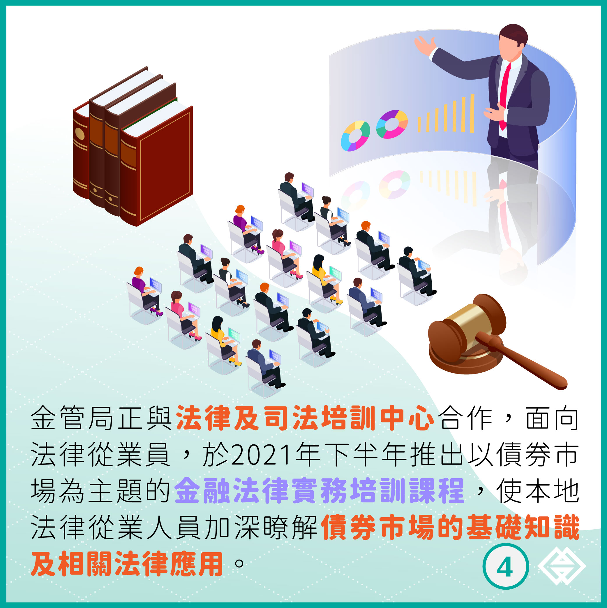 為培訓兼備金融和法律知識的從業人員,金管局正與法律及司法培訓中心合作,面向法律從業員,於2021年下半年推出以債券市場為主題的金融法律實務培訓課程,使本地法律從業人員加深瞭解債券市場的基礎知識及相關法律應用。