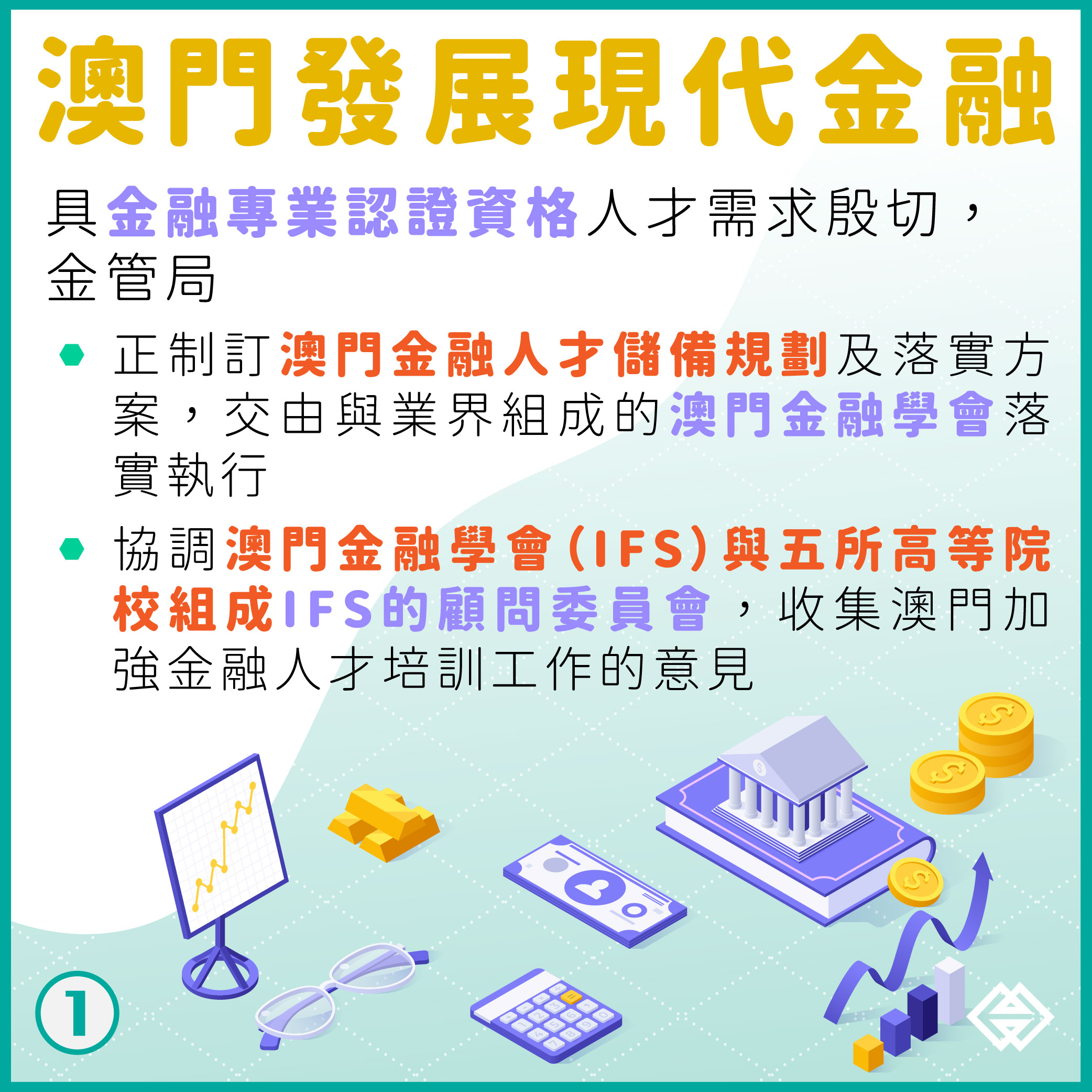 配合現代金融業發展所需,澳門金融管理局正制定澳門金融人才儲備建設規劃及落實方案,除透過澳門金融學會開展培訓活動外,亦將結合與高等院校、灣區城巿合作,具針對性地推動金融人才培訓工作,包括鼓勵澳門居民考取國際專業認證資格等,逐步建立本地金融專業人員隊伍。