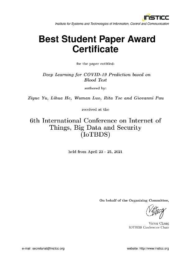 澳門理工學院計算機應用技術博士學位課程博士學生俞子悅與和麗華近日於2021年度國際物聯網、大數據與安全大會(IoTBDS 2021)發表題目為“深度學習:基於血液檢測的新冠肺炎預測研究”的學術論文,喜獲“最佳學生論文獎”,是本屆大會唯一獲獎的學生論文,獲大會高度評價。