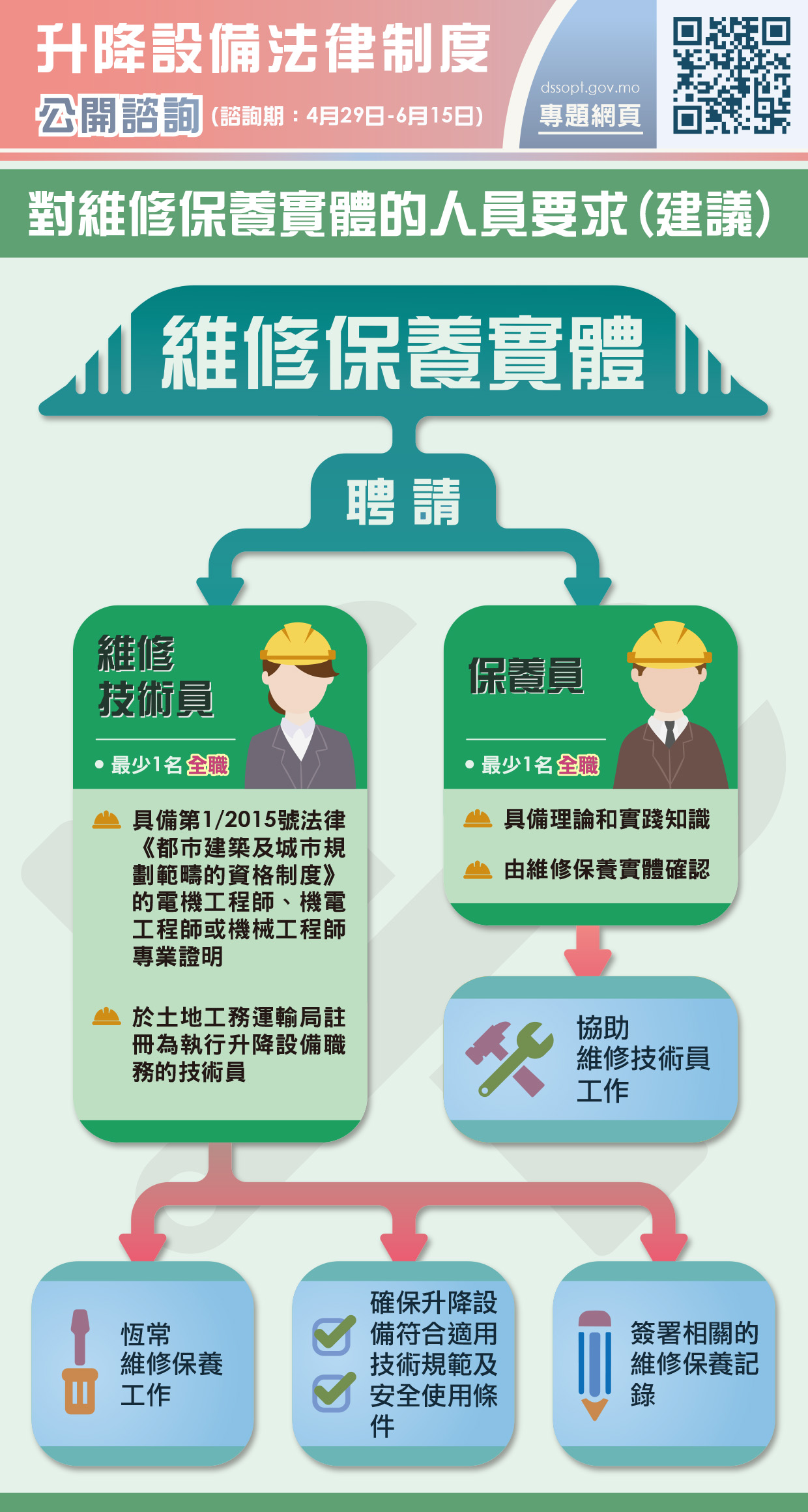 諮詢本文建議明確將“維修保養”及“檢驗”作為兩項由不同實體負責的工作,可在管理及監察上達到相互獨立,亦建議規範股東和組成技術人員的編制不能重疊等。為提升行業專業水平,建議對兩個實體的編制作出最低要求,其中,維修保養實體要求最少包括一名全職維修技術員及一名全職保養員的編制;檢驗實體則最少包括兩名全職技術指導員及四名全職檢驗員的編制。從事上述相關業務,除保養員外均須獲得相應專業資格,現時已登記的三類可從事升降設備業務的專業工程師有超過900位,相信可滿足市場需要。此外,由於未有明顯增加現時保養員的工作量,預計法律實施時不會對保養員的人力資源造成影響。