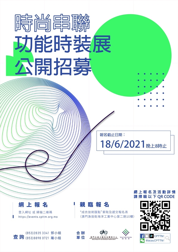 為使本澳時裝設計更多元發展,澳門生產力暨科技轉移中心與紡拓會合辦“時尚串聯─功能時裝展”,由參加者以特定功能布料設計服裝,報名由即日起至6月18日晚上8時,歡迎年滿18歲澳門居民參加。