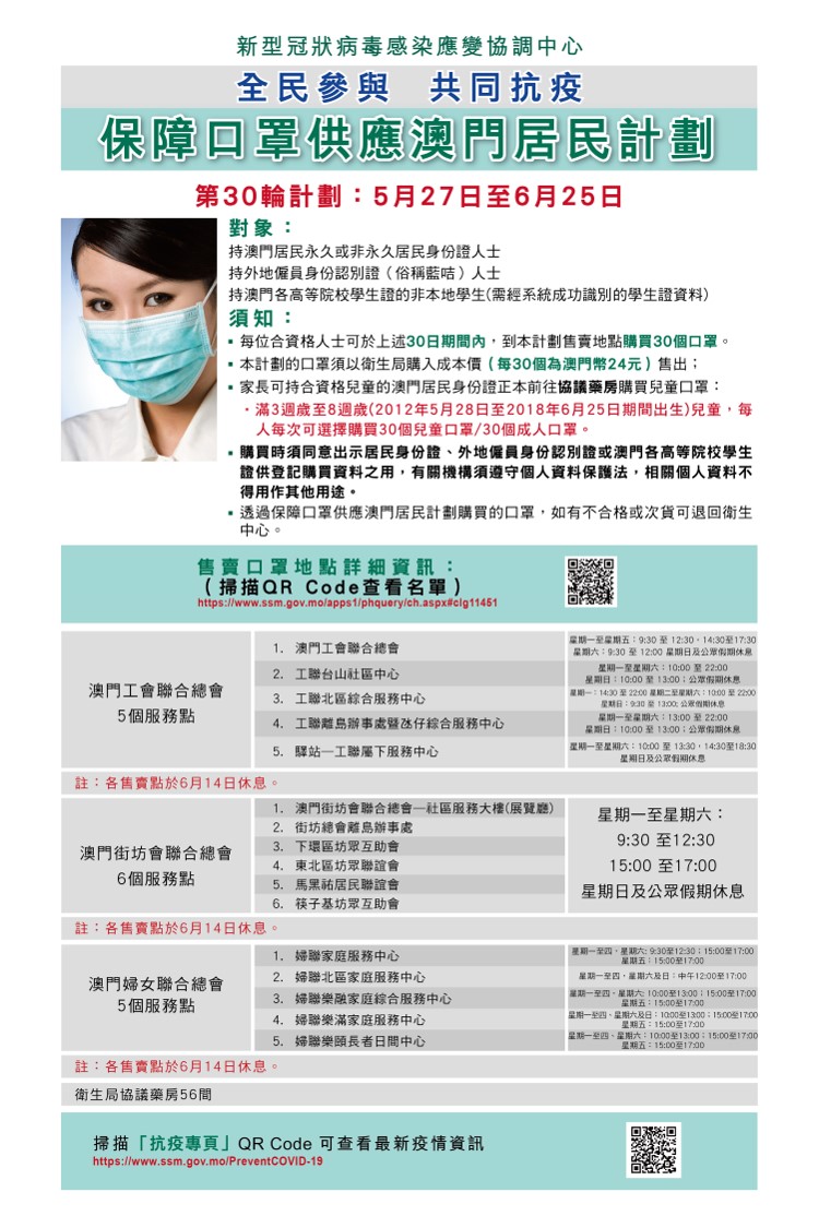 從第30輪保障口罩供應澳門居民計劃開始,衛生局轄下衛生中心和衛生站停售口罩,衛生局協議藥房和本澳三個社團(工聯、街總、婦聯)繼續提供售賣口罩服務,全澳共有72個售賣點。