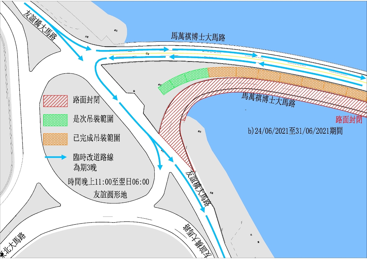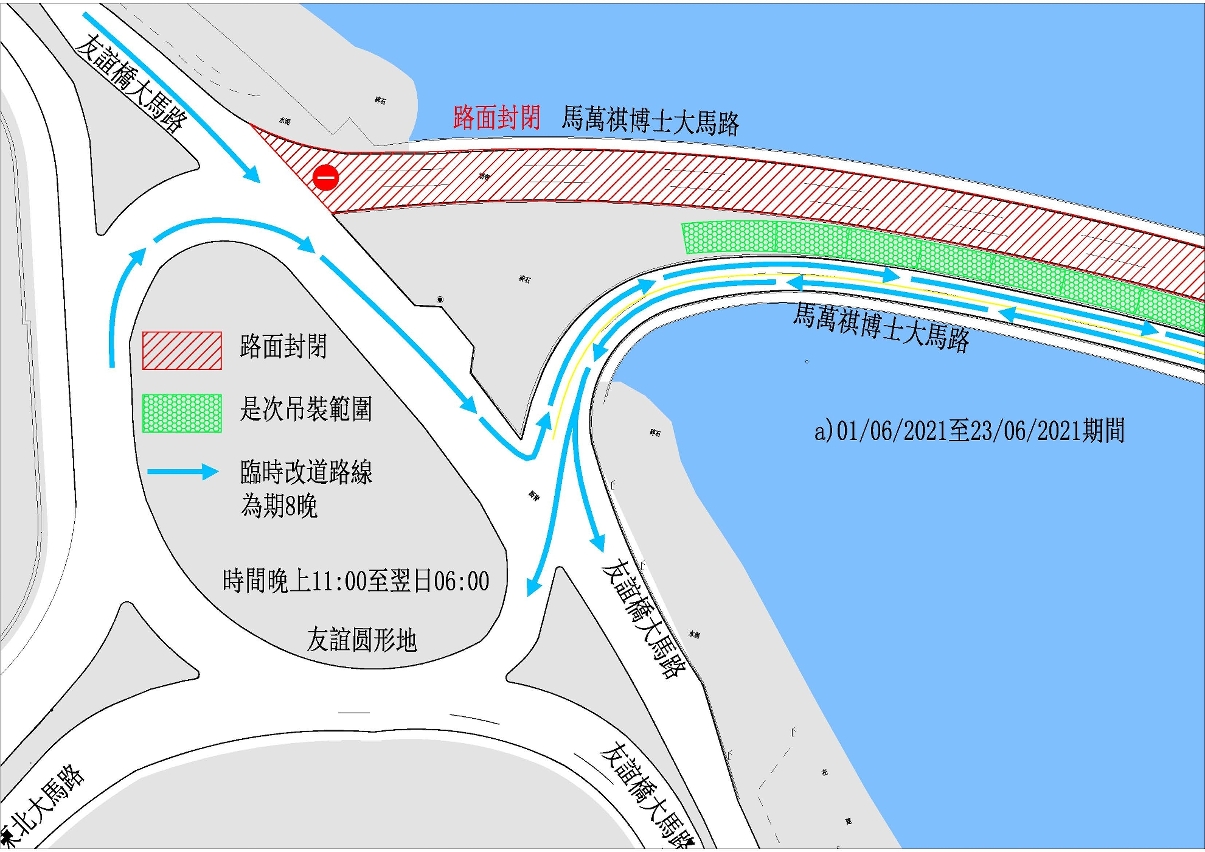 為配合友誼圓形地行車天橋鋼結構箱型樑的裝嵌工序,於6月1日起至7月15日期間,由晚上11時至翌日清晨6時友誼圓形地一帶需作有限度通車,請駕駛者留意現場交通指示。