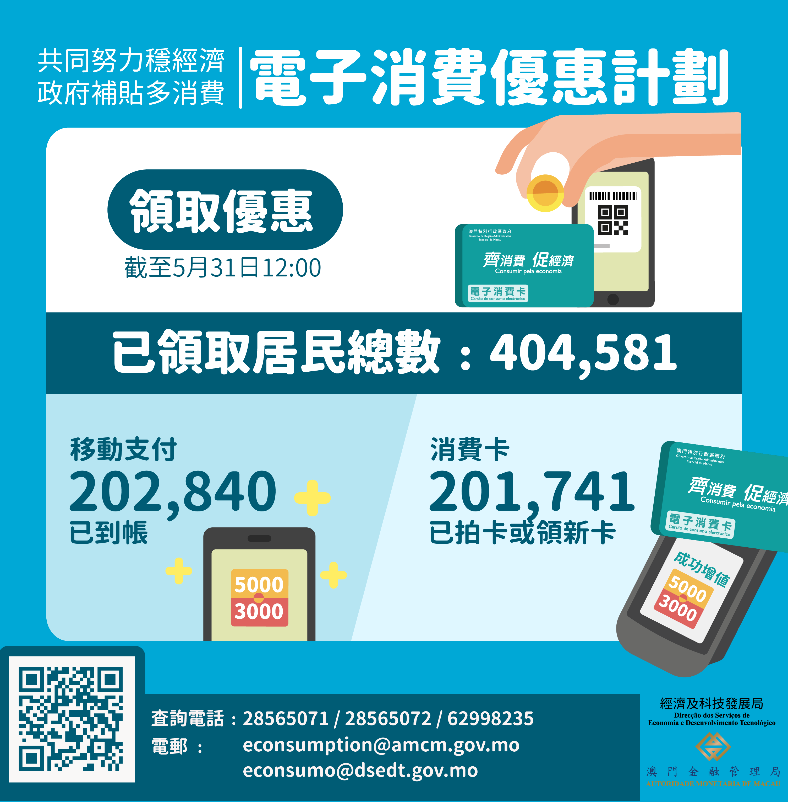 截至今(31)日中午12時,約40.5萬居民已領取“電子消費優惠”。其中,約20.2萬人完成“消費卡”拍卡加值或領取新卡;此外,約20.3萬人陸續收到“移動支付”自動到帳的優惠款項。