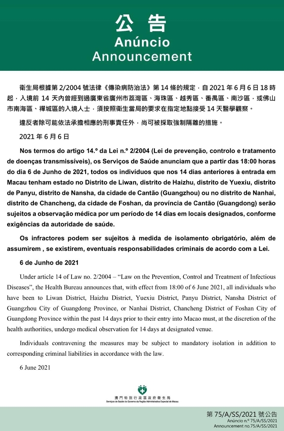 新型冠狀病毒感染應變協調中心宣佈,因應廣東省廣州市和佛山市的疫情變化,衛生局根據第2/2004 號法律《傳染病防治法》第14 條的規定,自 2021年6月6日下午6時起,所有在入境前14天內曾經到過廣東省廣州市荔灣區、海珠區、越秀區、番禺區、南沙區,或佛山市南海區、禪城區的入境人士,須按照衛生當局的要求在指定地點接受14 天醫學觀察,違反者除可能依法承擔相應的刑事責任外,尚可被採取強制隔離的措施。