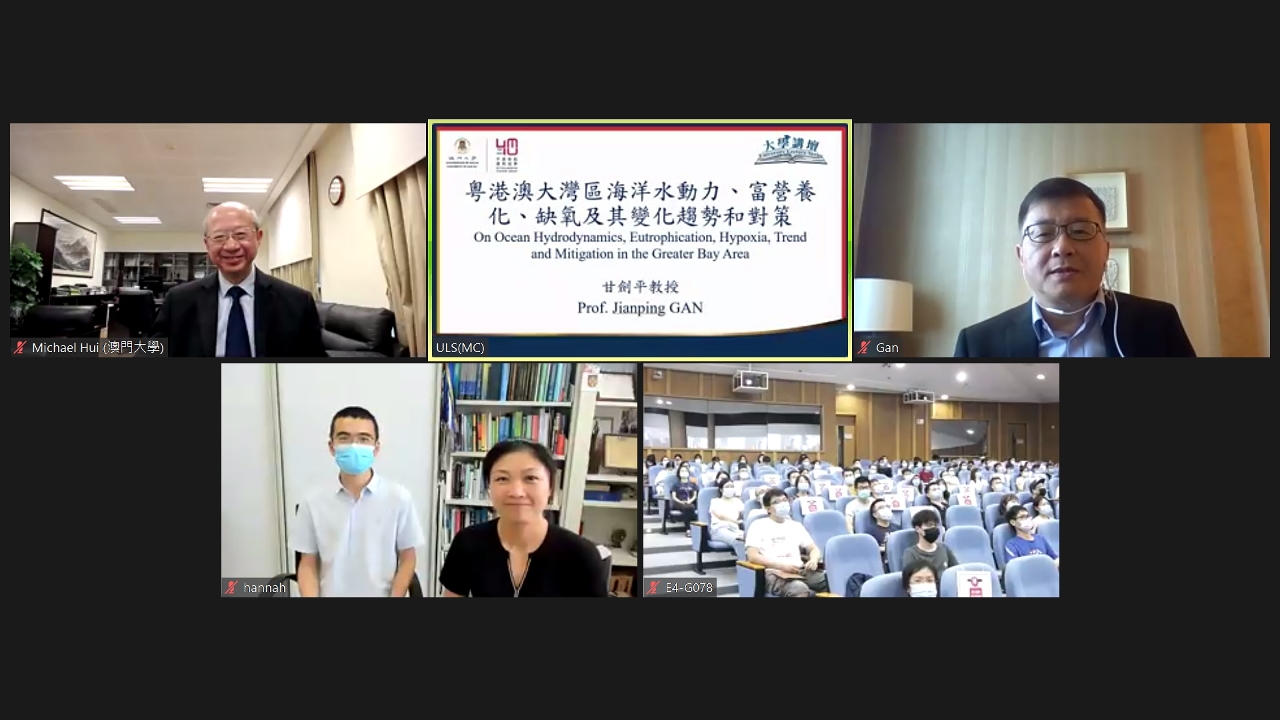 講座上,甘劍平簡述了大灣區海域目前受到愈趨嚴重的富營養化/缺氧問題,導致海洋酸化和其他生態系統破壞。為此,甘劍平及其團隊參與了一項名為“OCEAN-HK”的大型研究項目,從全球和局地角度,使用先進的跨學科觀測和計算機數值模擬方法,系統地探究了大灣區海域中海流—生物—地球化學的耦合過程。據此科學依據,進一步分析了大灣區水域的環境生態問題,並發展了應對策略,以緩解大灣區海洋富營養化和缺氧問題。他還提及正計劃與澳大團隊合作進行實地科研考察項目,期望明年開展。