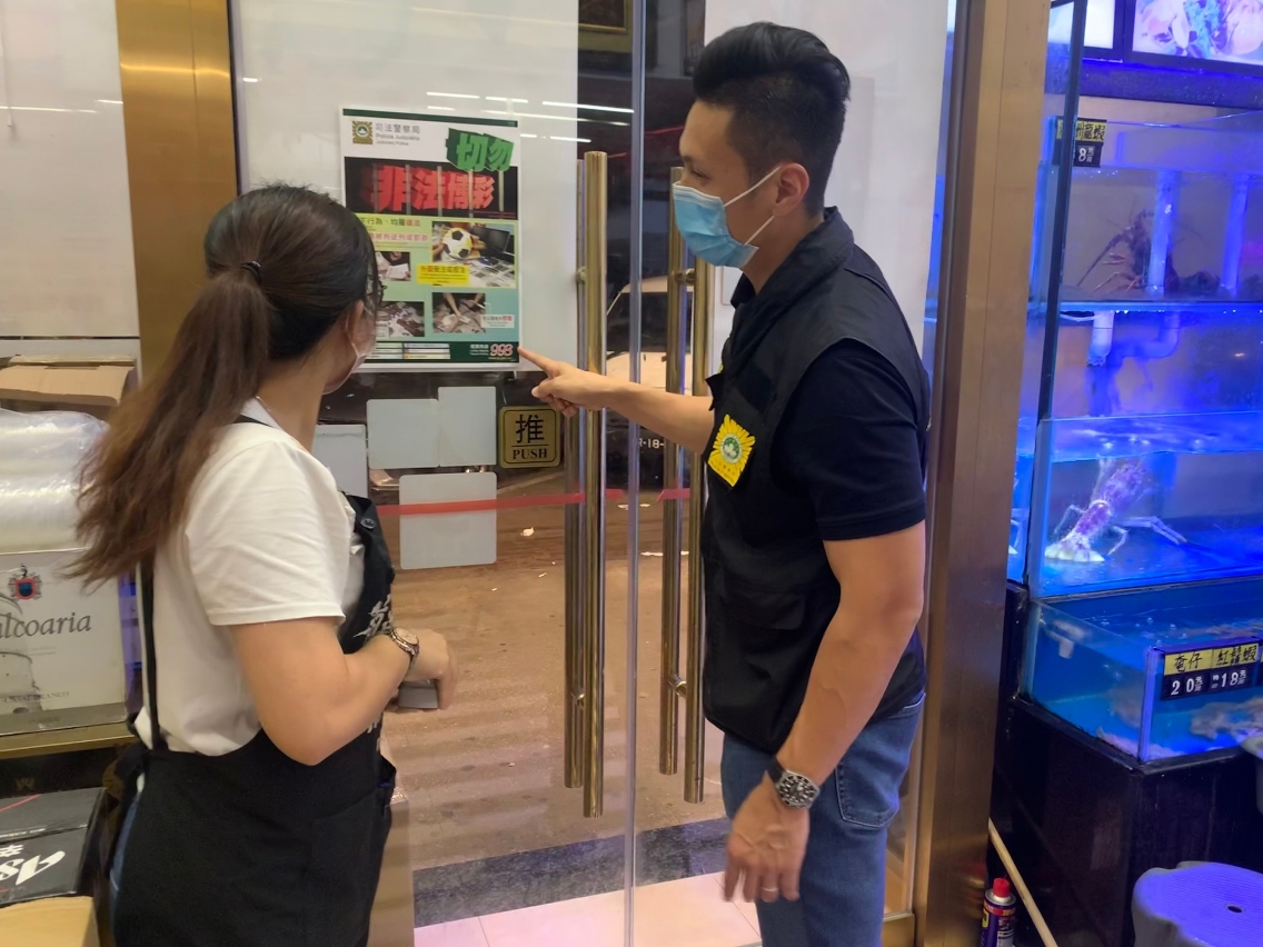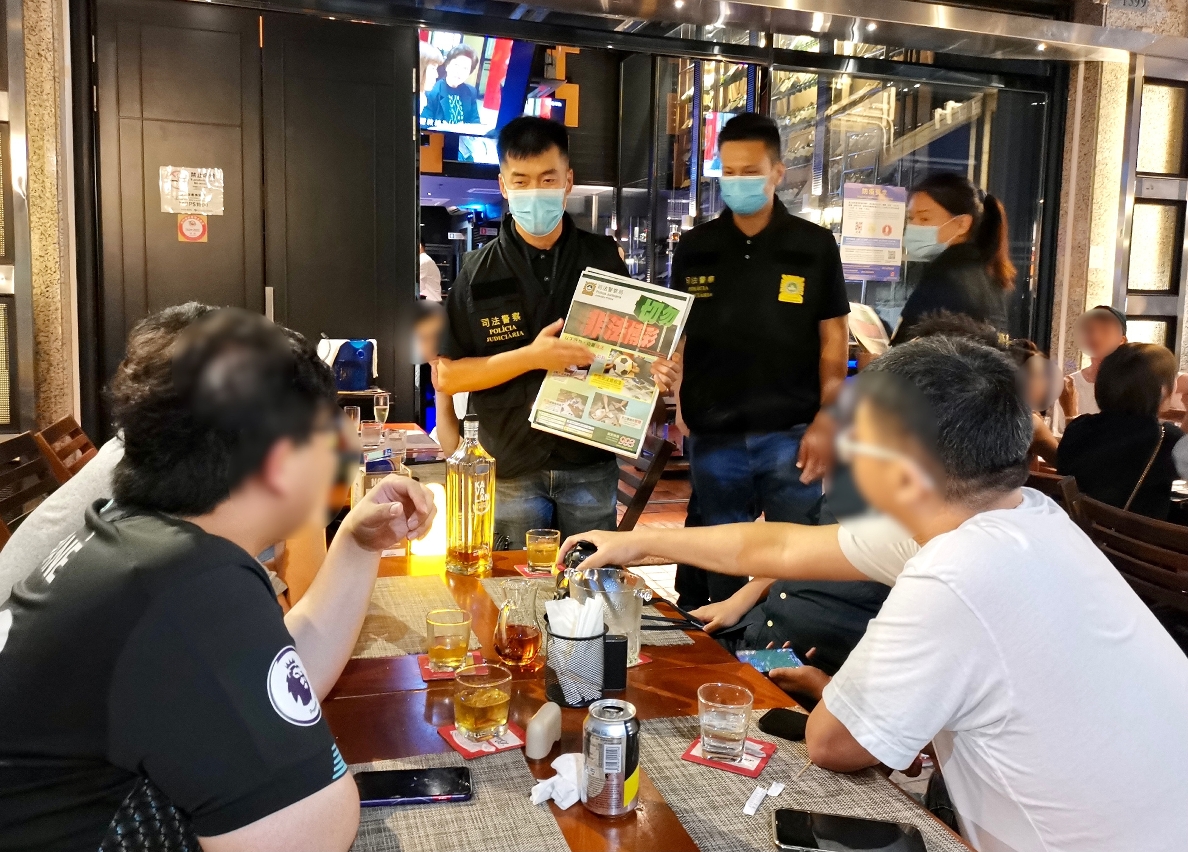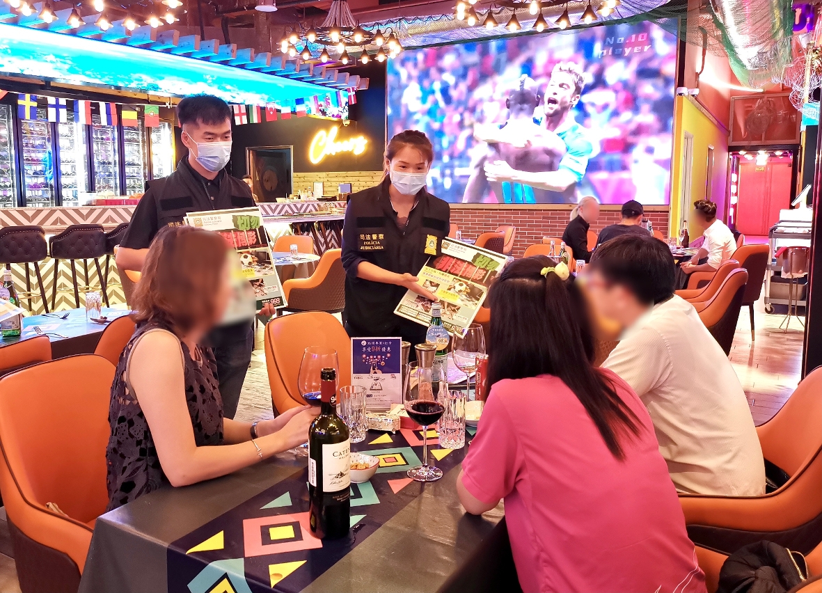 6月11日晚上,司警局派員到皇朝區的酒吧、食肆及娛樂場所等球迷聚集的地方開展“反外圍賭波”防罪宣傳,向店員及顧客派發防罪宣傳單張及講解相關法律知識,並在店舖內張貼“切勿非法博彩”宣傳海報,呼籲在場人士切勿參與非法足球博彩活動,否則會觸法並負上刑事責任。