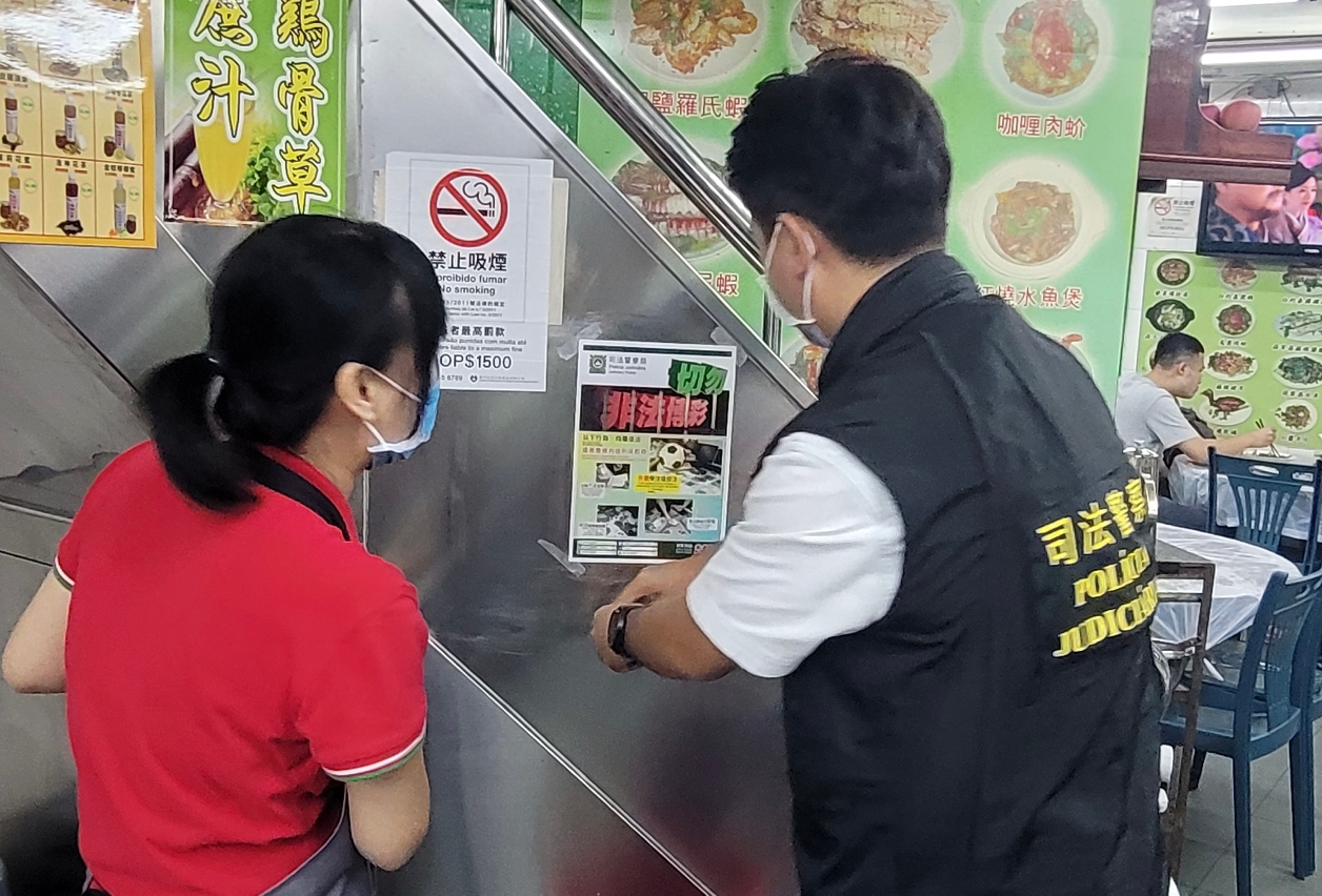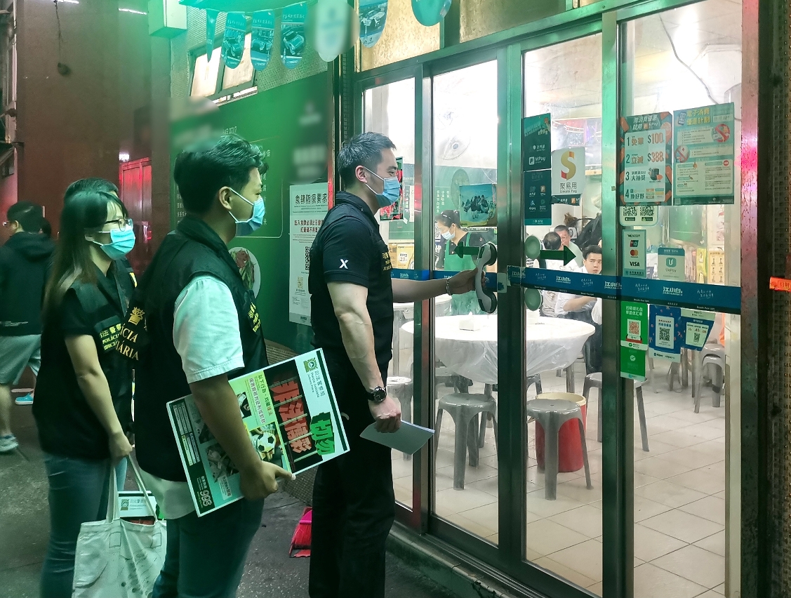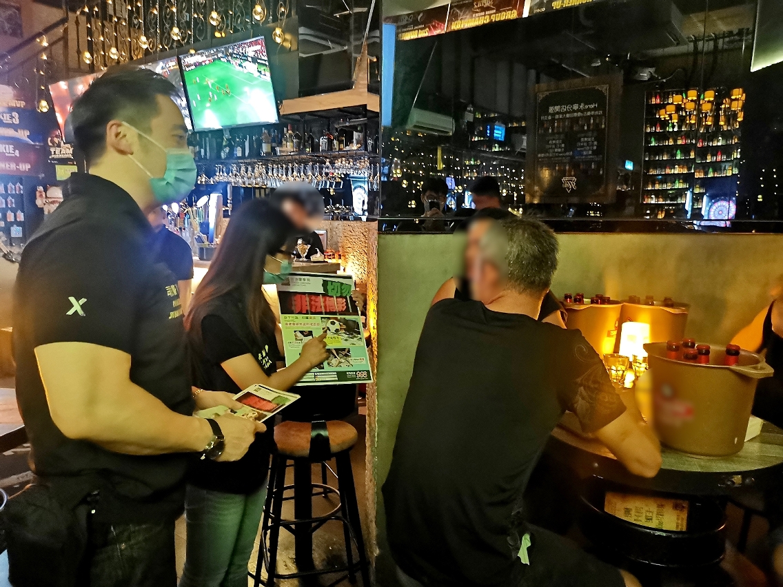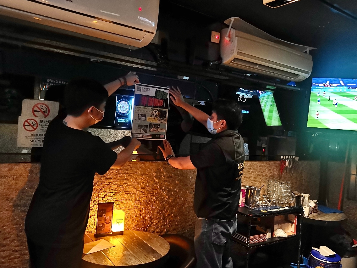 6月11日晚上,司警局派員到皇朝區的酒吧、食肆及娛樂場所等球迷聚集的地方開展“反外圍賭波”防罪宣傳,向店員及顧客派發防罪宣傳單張及講解相關法律知識,並在店舖內張貼“切勿非法博彩”宣傳海報,呼籲在場人士切勿參與非法足球博彩活動,否則會觸法並負上刑事責任。