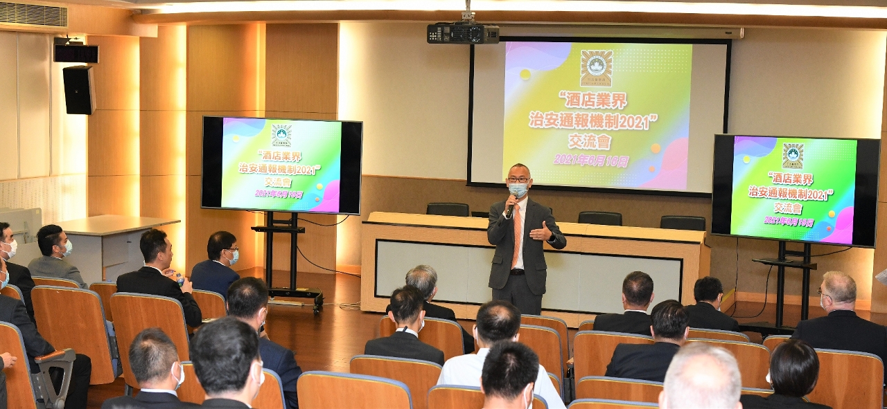 為加強與酒店業界的溝通和合作,共同預防和打擊於酒店場所發生的罪案,維護良好的社會治安秩序和本澳的旅遊形象,保障市民和旅客的生命財產安全,司法警察局舉行“酒店業界治安通報機制”交流會,司警局刑事調查廳廳長梁文照、毒品罪案調查處處長余光輝、有組織罪案調查處處長薛專耀及轄下人員,與約50名本澳酒店業界代表就持續優化現有治安通報機制、提升前線從業員的防罪意識和能力、加強警民合作防範罪案等問題進行探討交流。