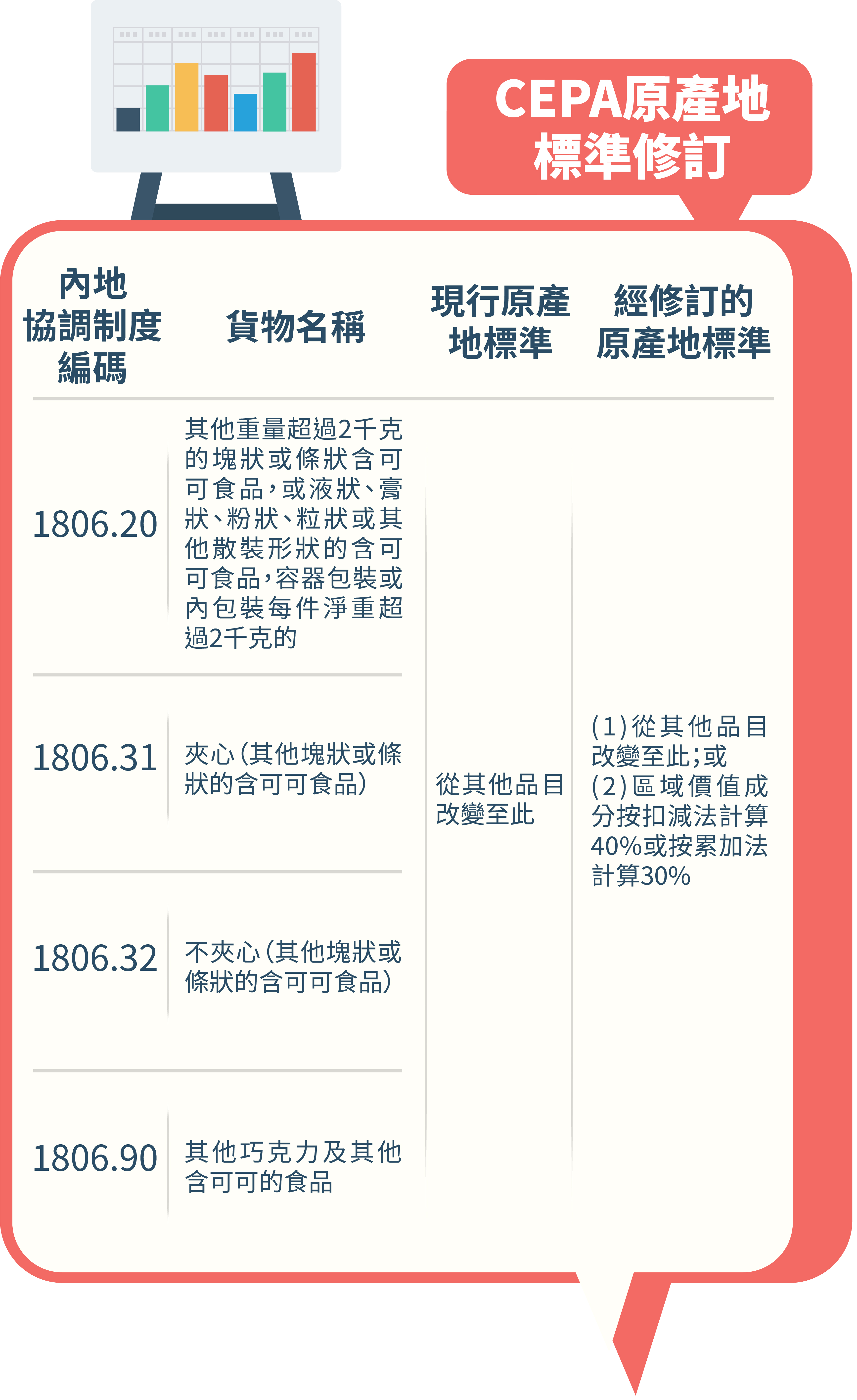經上半年收集業界需求並進行共同商議後,內地與澳門雙方同意對四項食品產品的CEPA貨物原產地標準作出修訂,並自今年7月1日起實施。該四類產品均為含可可的食品。由2019年至今,通過磋商機制成功落實的修訂原產地標準共18項,有關修訂為本澳企業創造更有利條件享受CEPA零關稅優惠。