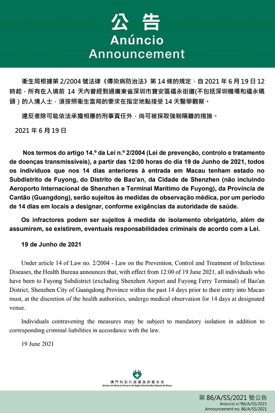新型冠狀病毒感染應變協調中心宣佈,因應廣東省的疫情變化,衛生局根據第2/2004 號法律《傳染病防治法》第14 條的規定,自 2021年6月19日中午12時起,所有在入境前14天內曾經到過廣東省深圳市寶安區福永街道(不包括深圳機場和福永碼頭)的入境人士,須按照衛生當局的要求在指定地點接受14 天醫學觀察,違反者除可能依法承擔相應的刑事責任外,尚可被採取強制隔離的措施。