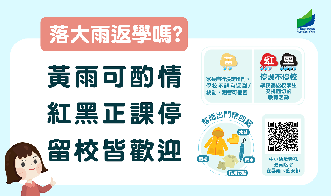 為進一步落實暴雨警告信號下上學的優化措施,教青局已聯繫多所學校的負責人,聽取執行上的意見,並商討優化措施的細節,包括將優化措施落實為具體指引,並加強宣傳。為進一步向廣大家長和學生宣傳暴雨警告信號下的上學安排,教青局已製作優化措施的圖文包,口號為“黃雨可酌情,紅黑正課停,留校皆歡迎”。