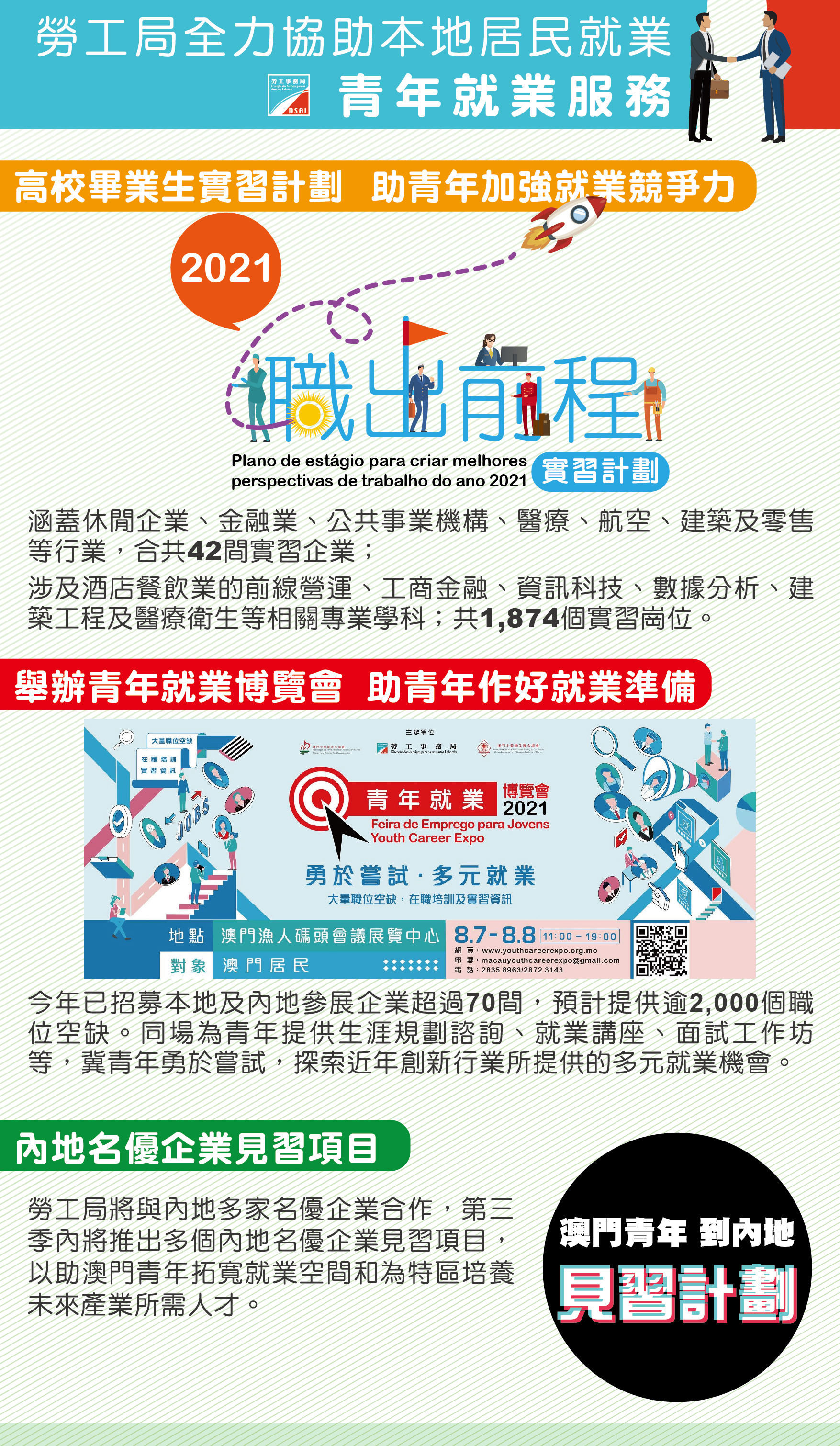 2021年2月勞工局首次與內地知名跨國企業合作推出“澳門青年到內地字節跳動見習計劃”,見習為期3個月,由企業資深人員指導工作,以促進澳門青年在互聯網科技行業的業務能力的發展,並為產業培育和儲備人才,計劃提供48個見習崗位,涉及人力資源助理、設計助理、創意運營、數據標注運營及項目管理等範疇,見習地點為廣東省和福建省內企業業務涵蓋的城市。最終有17人參與是次見習活動,並已於5月10日到各自的見習崗位報到,開展為期3個月的見習。