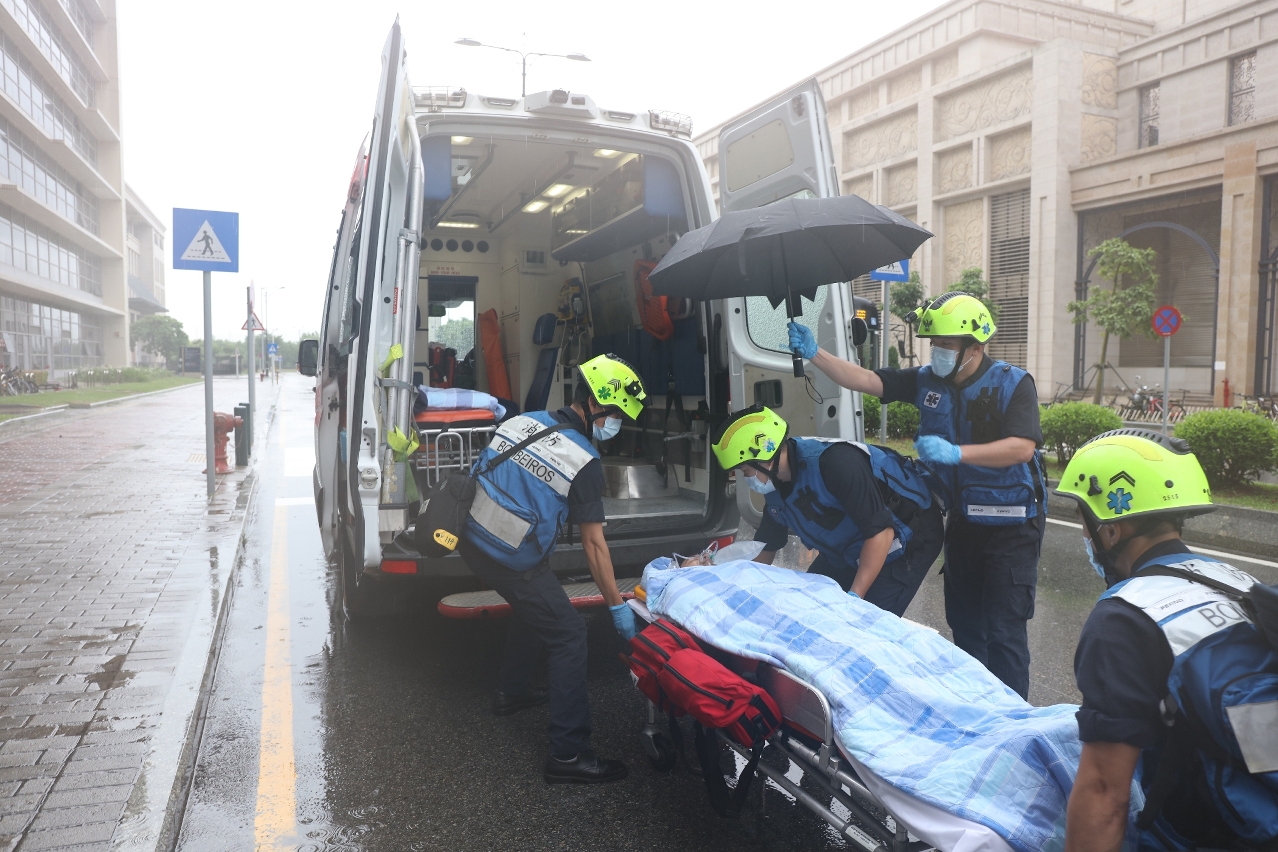 演習模擬於澳門大學N21科研大樓功能磁共振實驗室內,操作員正在使用功能性磁振造影儀器為1名受試者進行實驗研究,在掃描的過程中,受試者因身體不適暈倒,操作員馬上停止掃描,並用對講機呼喚受試者但沒有得到回應,故立即啟動內部應急處理程序,並即時致電消防局求助。消防局接報後,立即派出3部緊急車輛及13名消防人員前往現場救援,由於實驗室內存有磁場,內進消防人員須除下身上金屬物品,然後使用實驗室內的磁共振兼容工具將受試者救出,進行初步護理後模擬送往醫院治理。