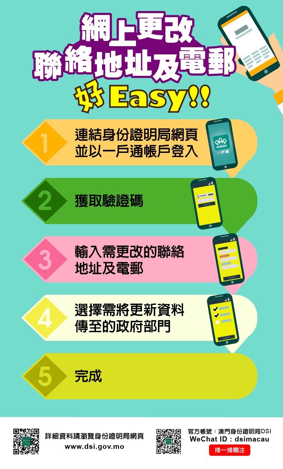 另須留意,基於安全理由,網上服務不適用於更改居民身份檔案內的聯絡電話,如需更新,市民可透過分佈全澳49個地點的多功能自助服務機,或親臨身份證明局服務點(包括南灣身份證明局、黑沙環政府綜合服務大樓及離島政府綜合服務中心)辦理相關手續。有關自助服務機的功能及地點,可瀏覽身份證明局網頁(www.dsi.gov.mo/kiosk_c.jsp)。