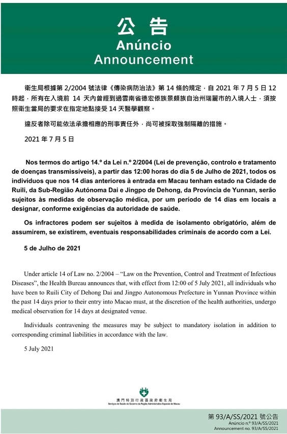 新型冠狀病毒感染應變協調中心宣佈,因應雲南省的疫情變化,衛生局根據第2/2004 號法律《傳染病防治法》第14 條的規定,自 2021年7月5日中午12時,所有在入境前14天內曾經到過雲南省德宏傣族景頗族自治州瑞麗市的入境人士,須按照衛生當局的要求在指定地點接受14 天醫學觀察,違反者除可能依法承擔相應的刑事責任外,尚可被採取強制隔離的措施。