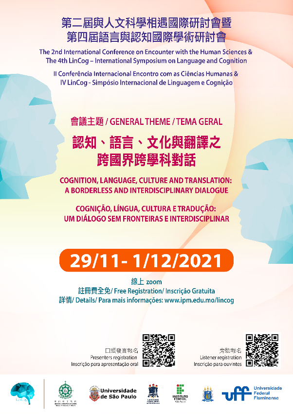 為進一步推動認知與語言等相關領域的跨學科研究,搭建以澳門為橋樑的粵港澳大灣區、中國與葡語國家、中國與世界的人文科學學術交流協作平台,澳門理工學院語言及翻譯高等學校(ESLT-IPM)與巴西聖保羅大學(USP),聯合弗魯米嫩塞聯邦大學(UFF)、伯南布哥農業聯邦大學(UFRPE)以及聖保羅聯邦學院(IFSP)等院校共同組織舉辦“第二屆‘與人文科學相遇’國際研討會暨第四屆語言與認知國際學術研討會”。研討會將於2021年11月29日至12月1日以線上形式舉行,主題為“認知、語言、文化與翻譯之跨國界跨學科對話”,下設“認知、語言習得與教學”、“認知、文化與文學”、“認知與翻譯”、“認知與口譯”、“認知與計算器輔助翻譯及機器翻譯”、“認知、語用與超級多樣性”、“認知、語法與話語”七個分議題。現誠邀海內外學者就相關領域進行投稿並參加會議。